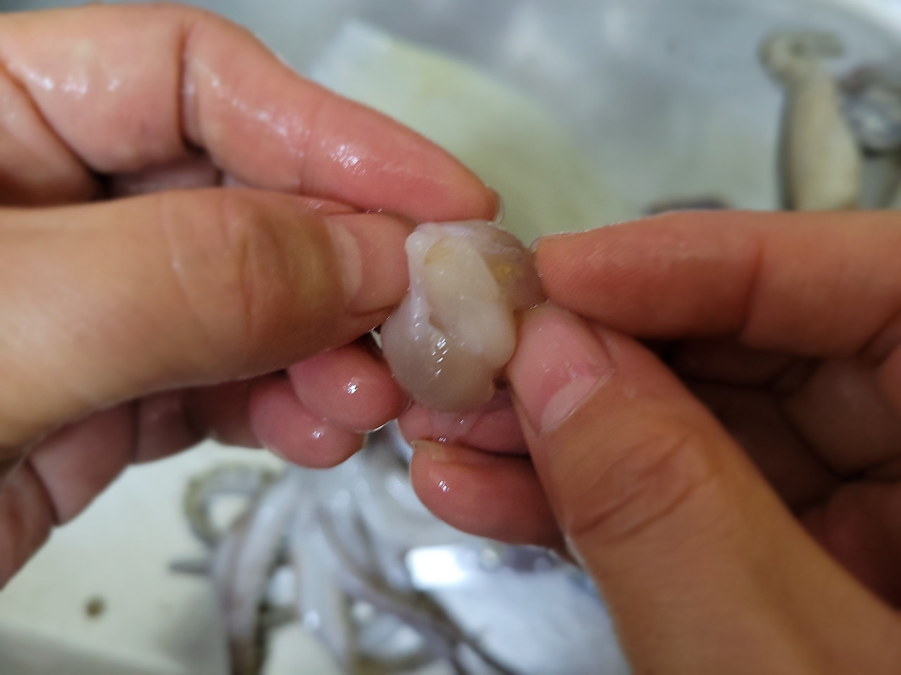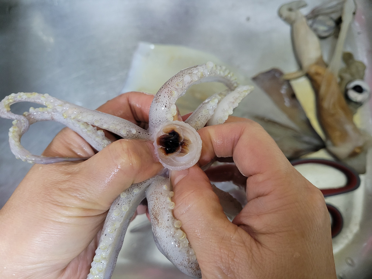 9. 마지막으로 오징어 다리 안쪽에 있는 입을 떼줍니다. 이빨(검은 부분)은 버리고 입은 맛있게 먹을 거예요.