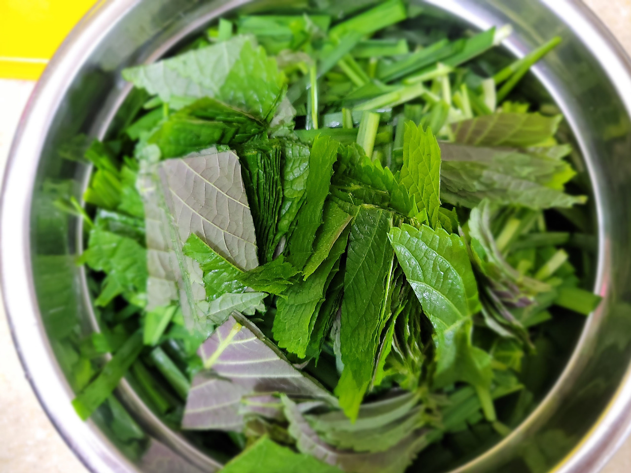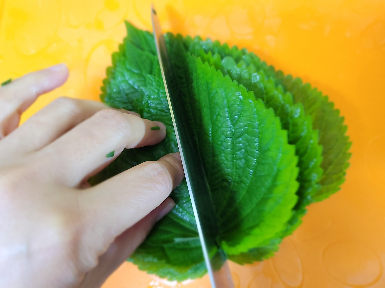 4. 깻잎도 물기를 털고 2cm 크기로 썰어주세요.