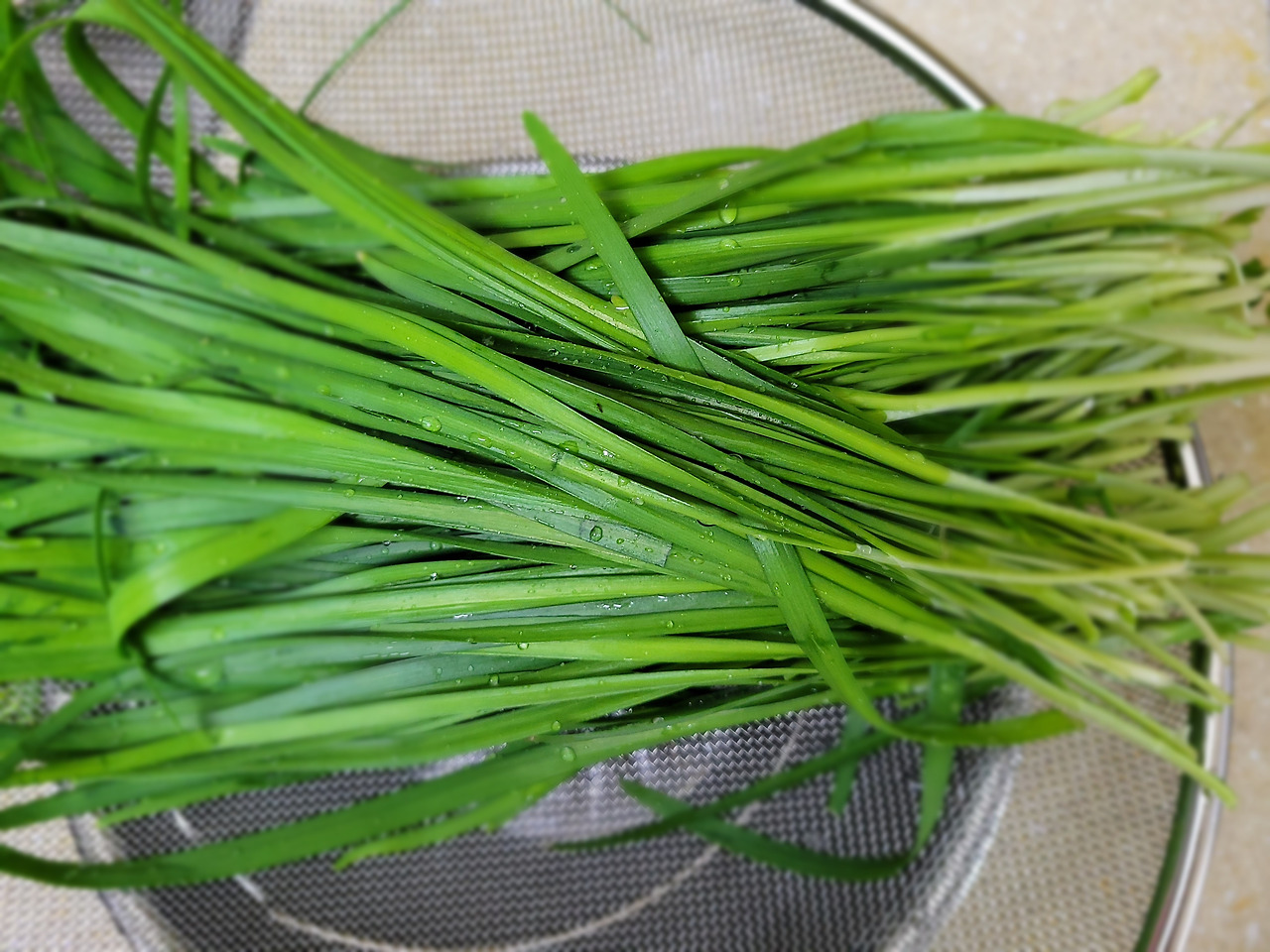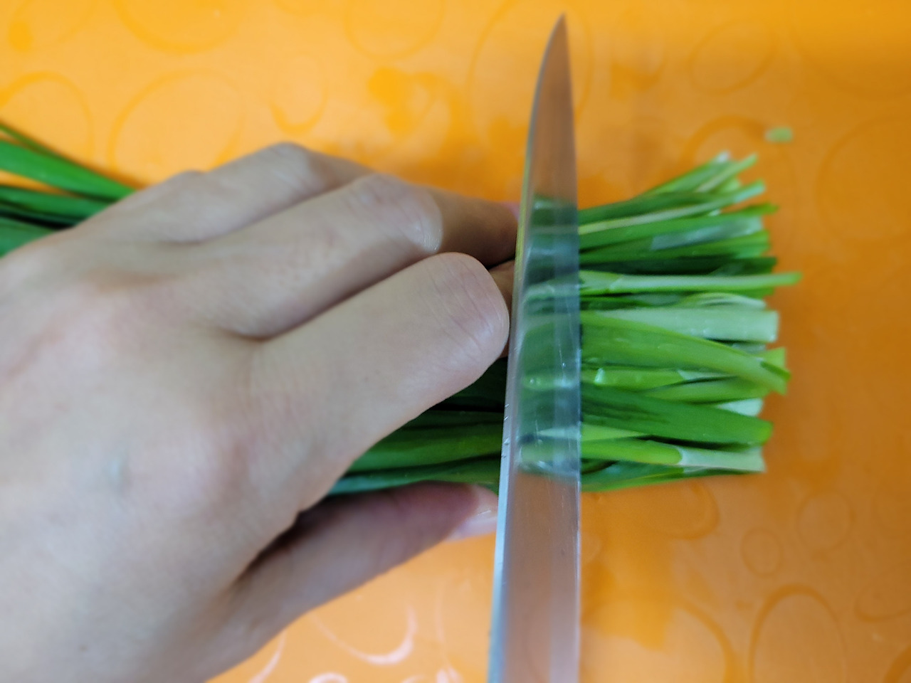 3. 부추 물기를 탁탁 털어서 먹기 좋게 4cm 크기로 썰어줍니다.