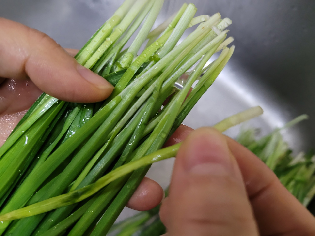 1. 부추를 씻을 때 누렇거나 지저분한 부분은 다듬어줍니다.
