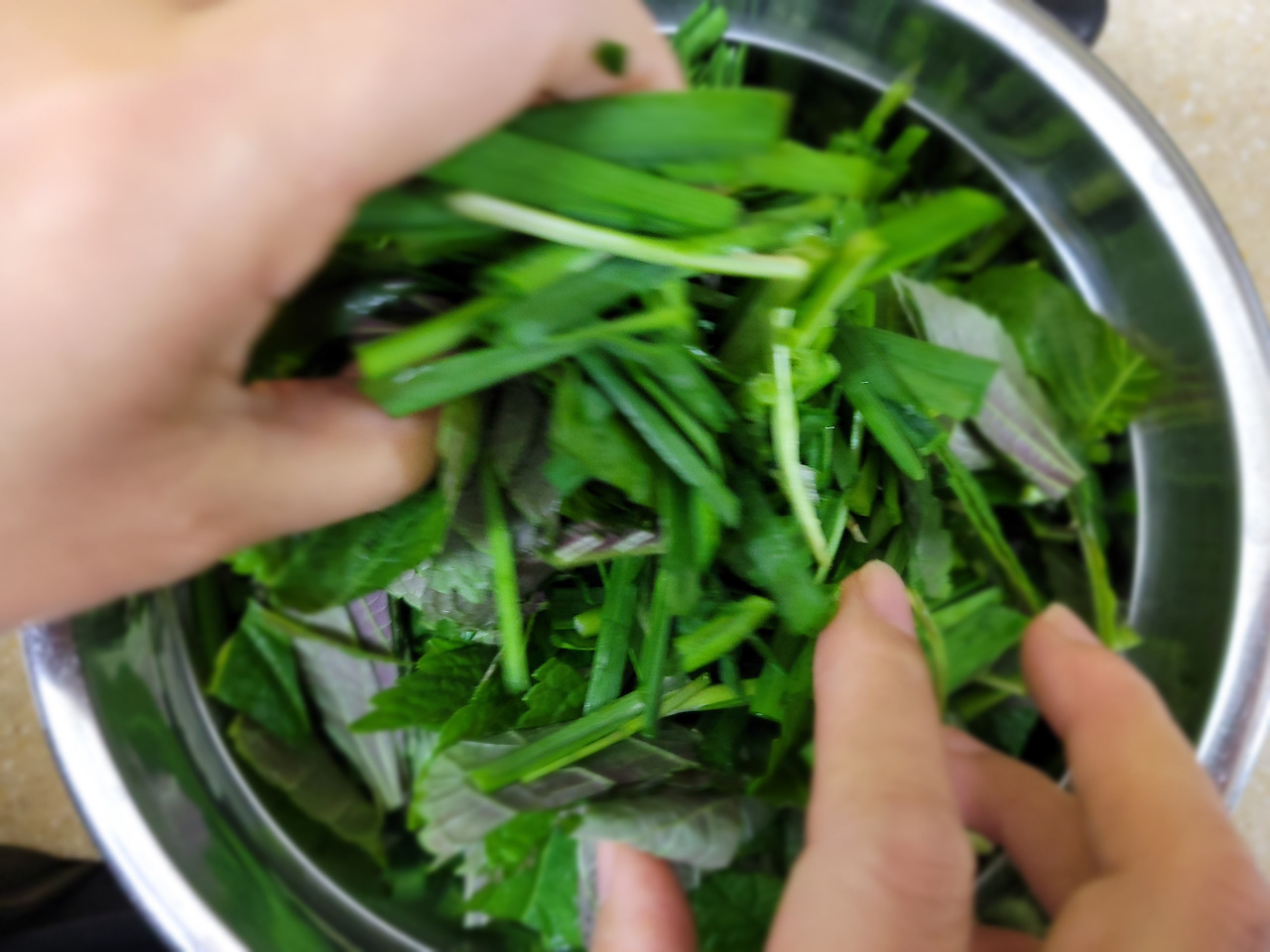 5. 뭉친 깻잎을 풀어줘서 채소가 고루고루 섞이게 합니다.