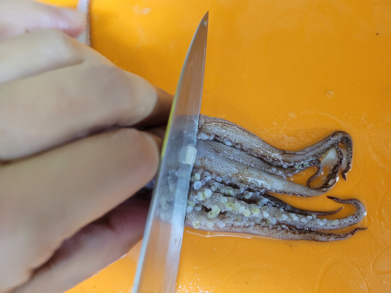 12. 오징어 다리는 끝 부분은 길게 잘라주고, 나머지는 4cm 크기로 썰어줍니다.