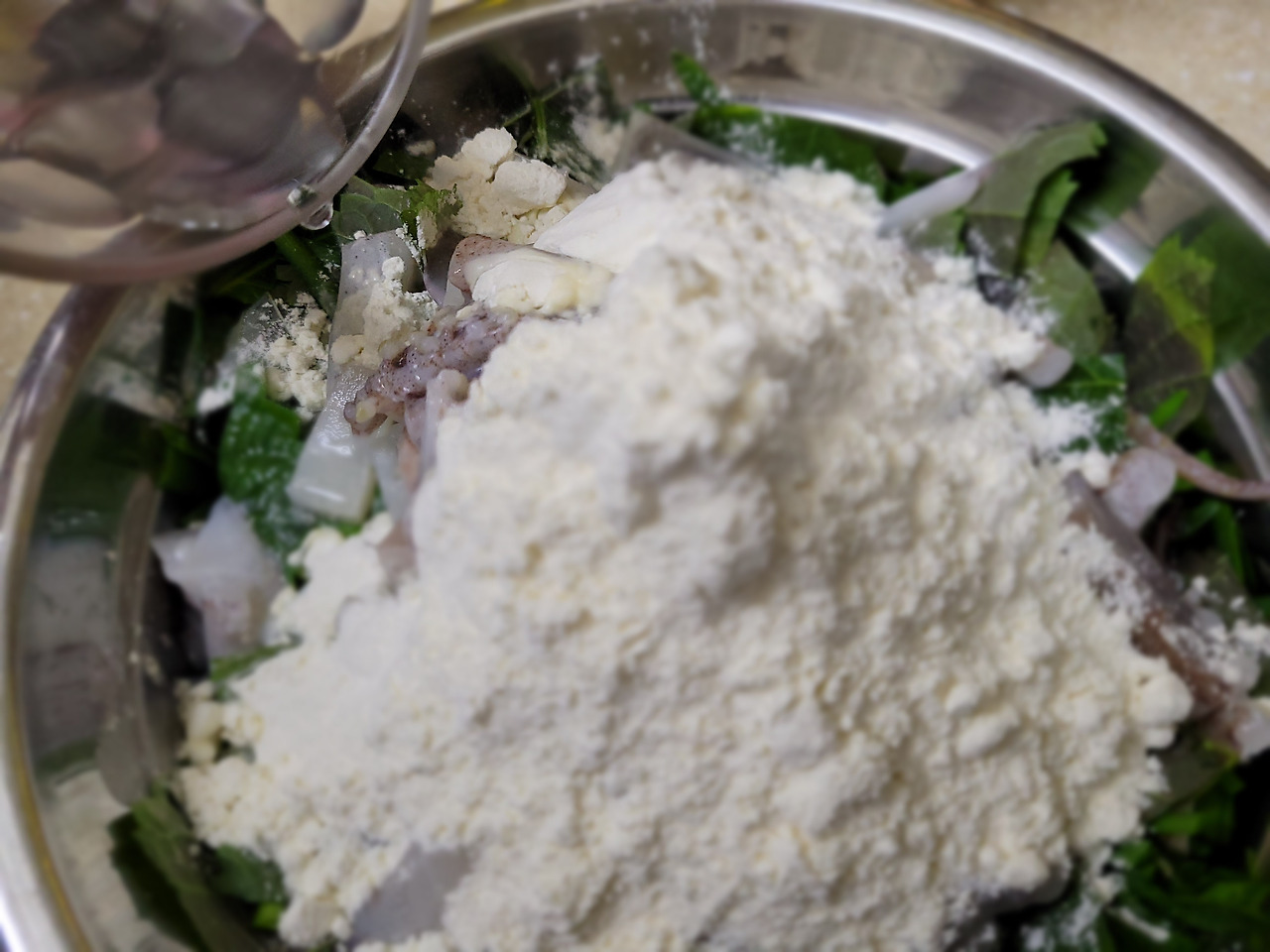16. 부침가루를 채소가 엉길 정도로만 부어줍니다.
