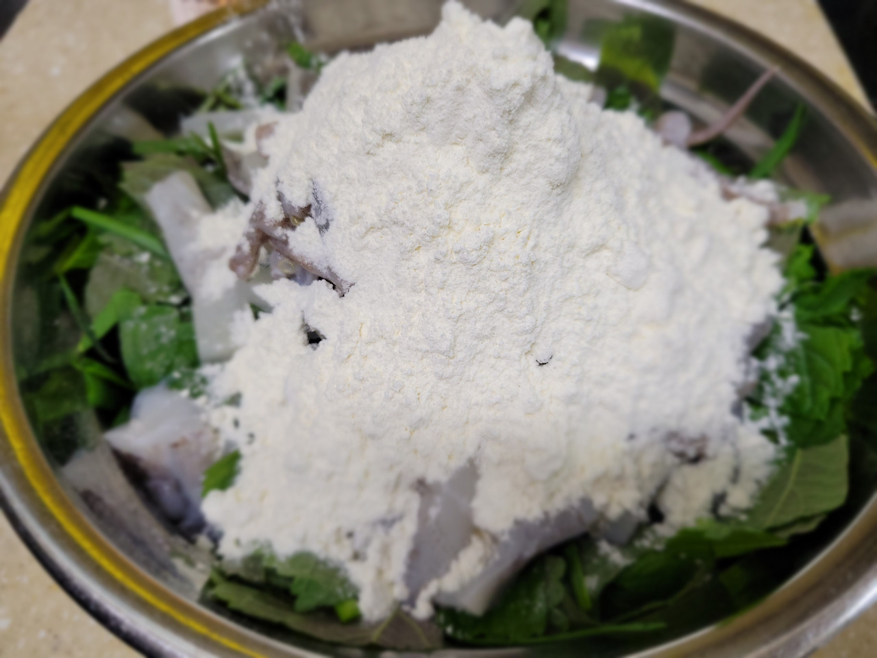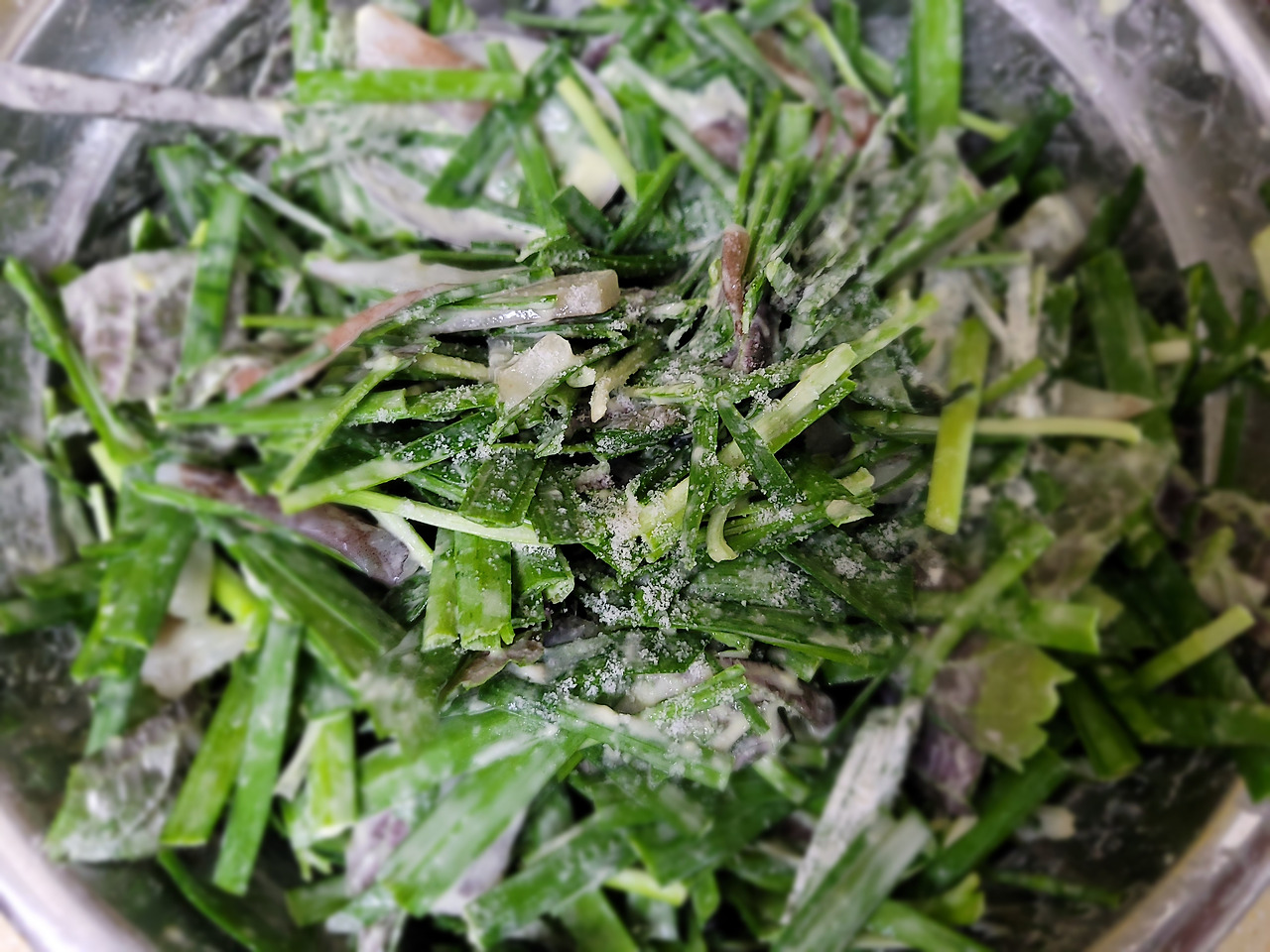 오른쪽 이미지처럼 부침가루가 야채에 충분히 묻고, 바닥에 물이 흥건하지 않을 정도로 농도를 맞춰주세요