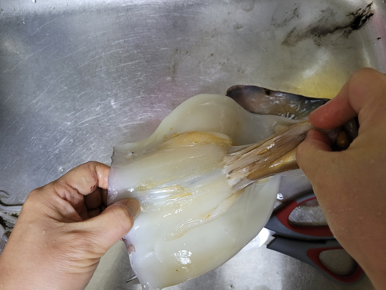 7. 세 가지 부위를 제거할 거예요. 먼저, 오징어 몸통의 내장을 쭈욱 잡아당겨 떼줍니다.