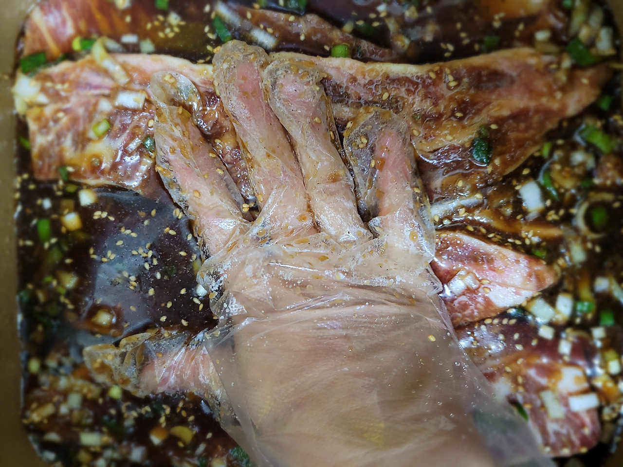 12. 고기에 양념을 묻히고 나서 양념이 잘 배게 꾹꾹 눌러줍니다.