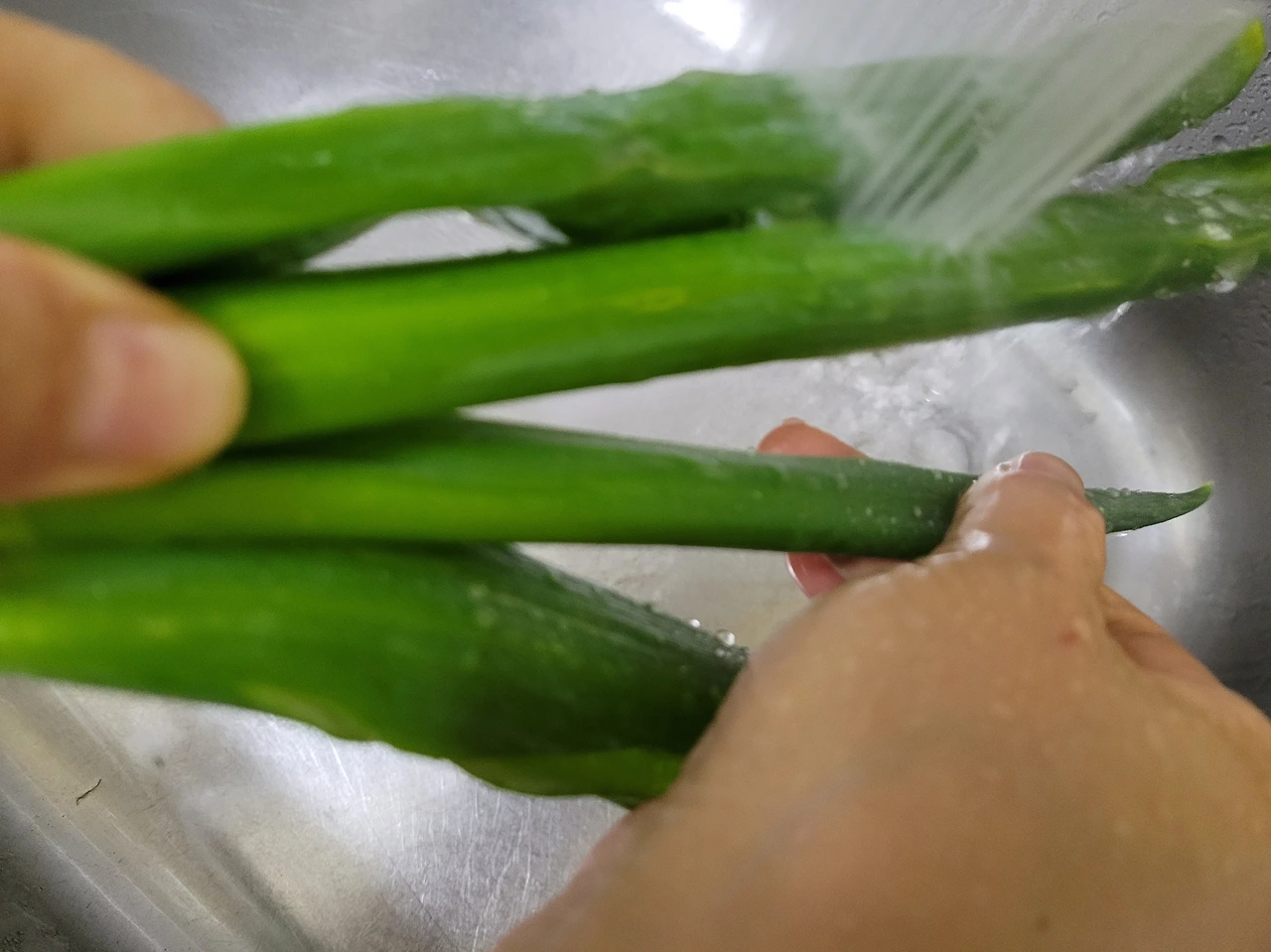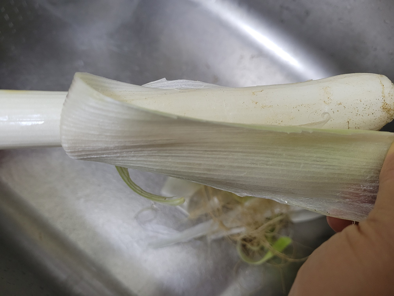 2. 대파의 파뿌리를 자르고 겉껍질을 벗겨 깨끗이 씻어주세요.