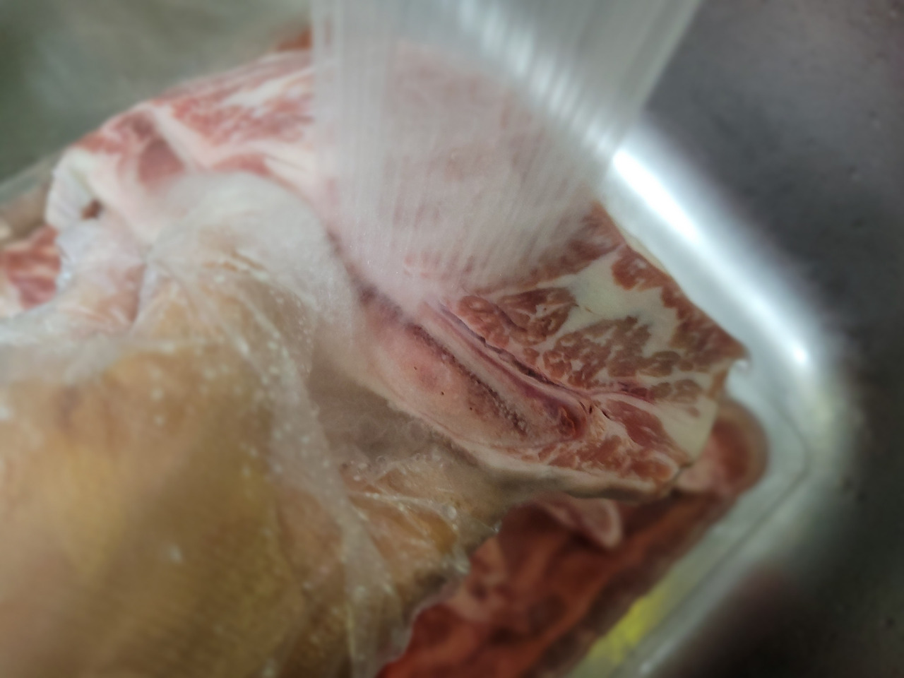 1. 냉동 고기를 하루 전날 냉장고로 옮겨 해동하고, 30~40분 찬물에 담가 핏물을 빼줍니다.