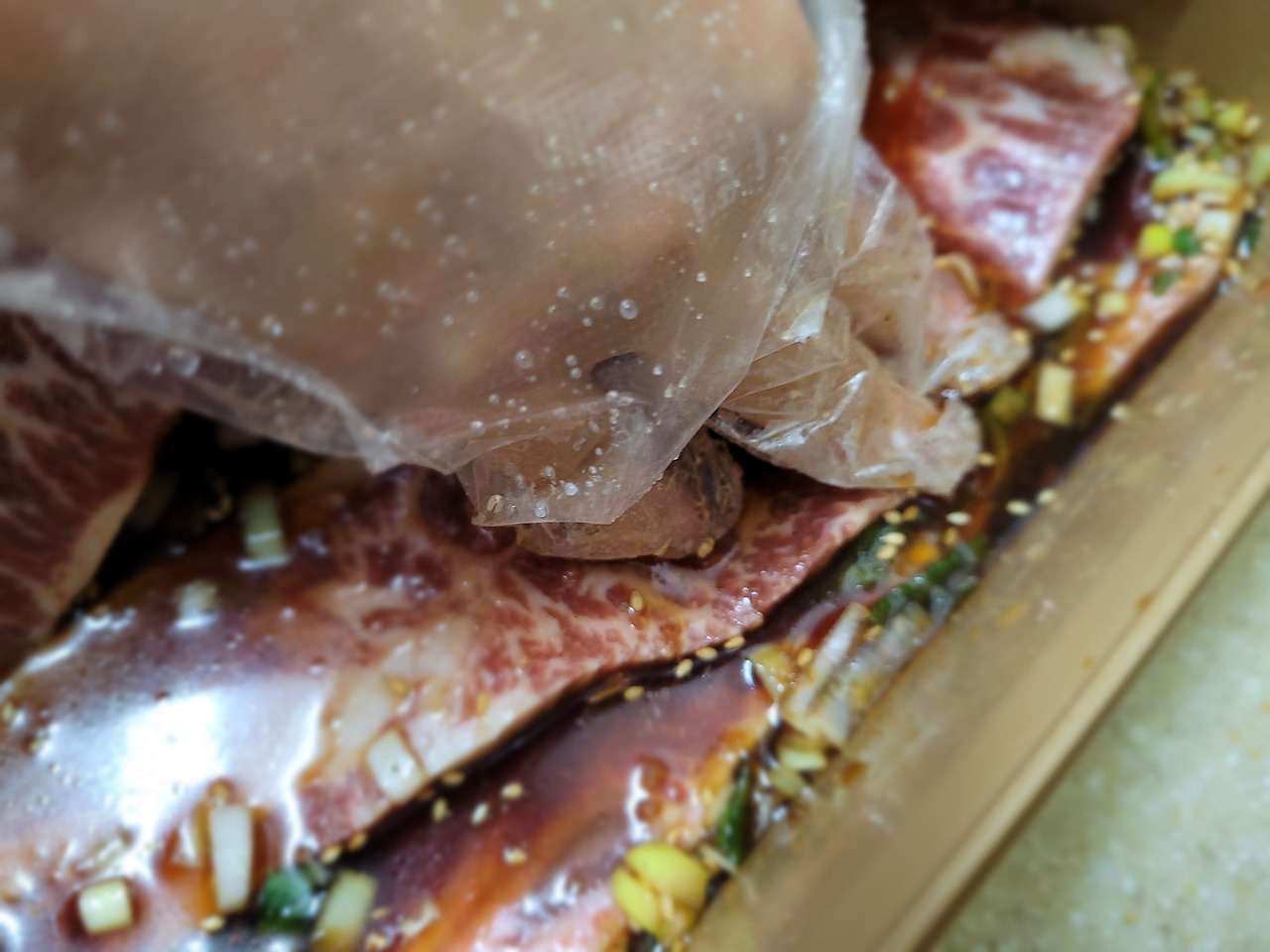 13. 앞으로 두어 시간 고기를 재워둘 거예요. 도중에 한 번 위아래로 뒤집어주면 좋습니다.