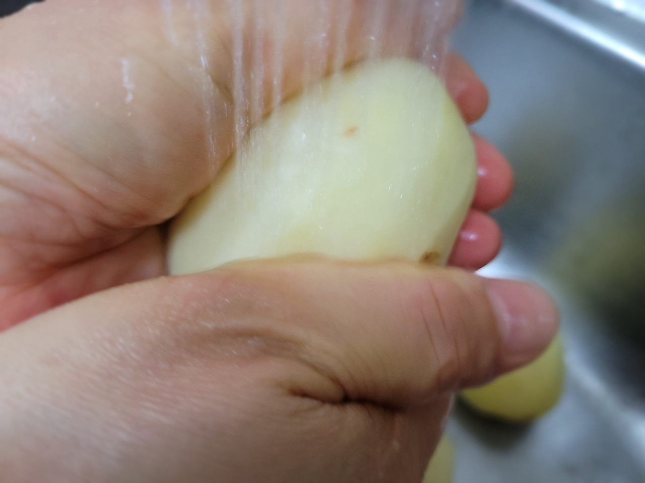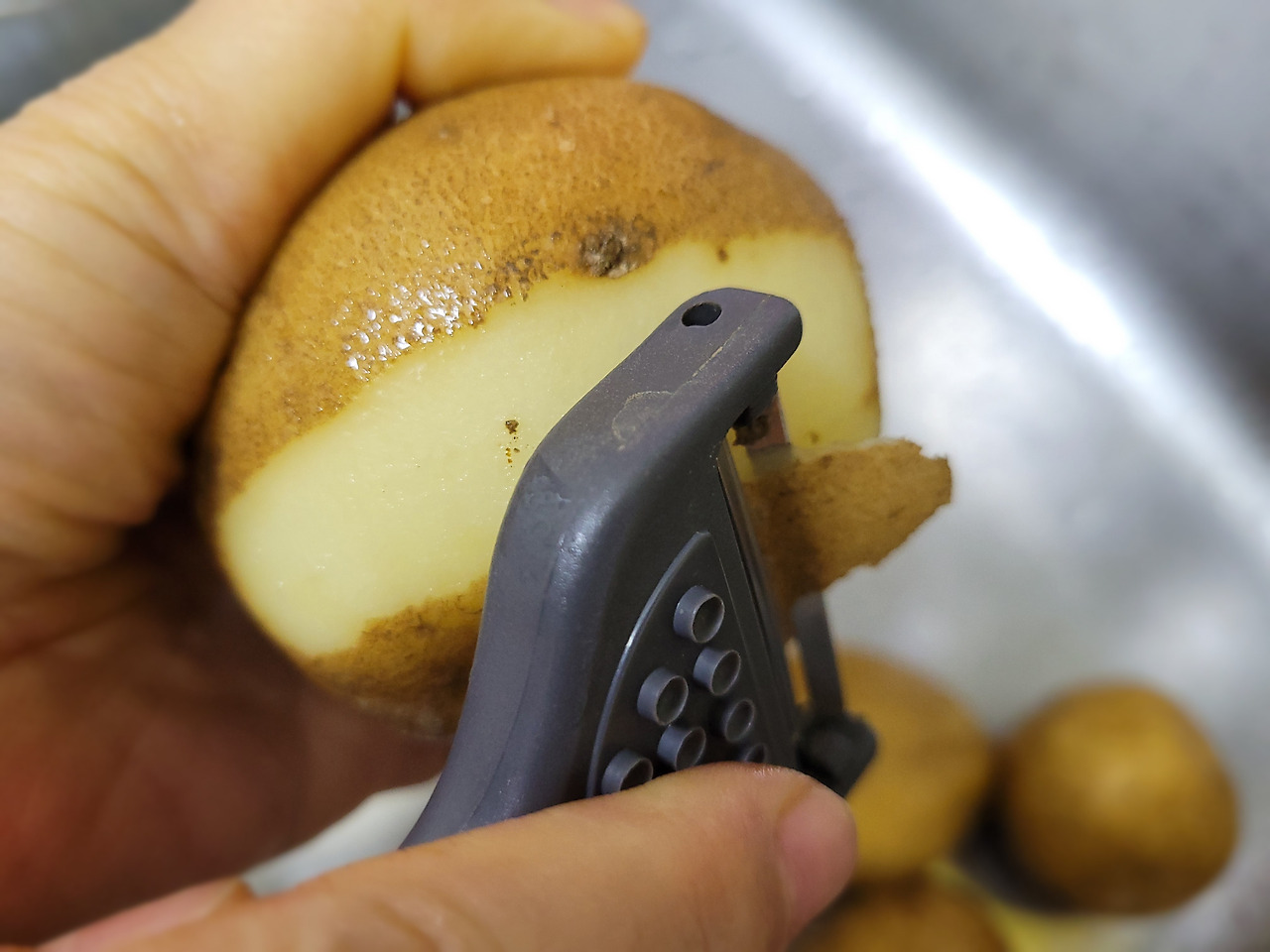 7. 감자에 묻은 흙을 물로 가볍게 씻어낸 뒤, 감자 껍질을 벗기고 깨끗이 씻어줍니다.