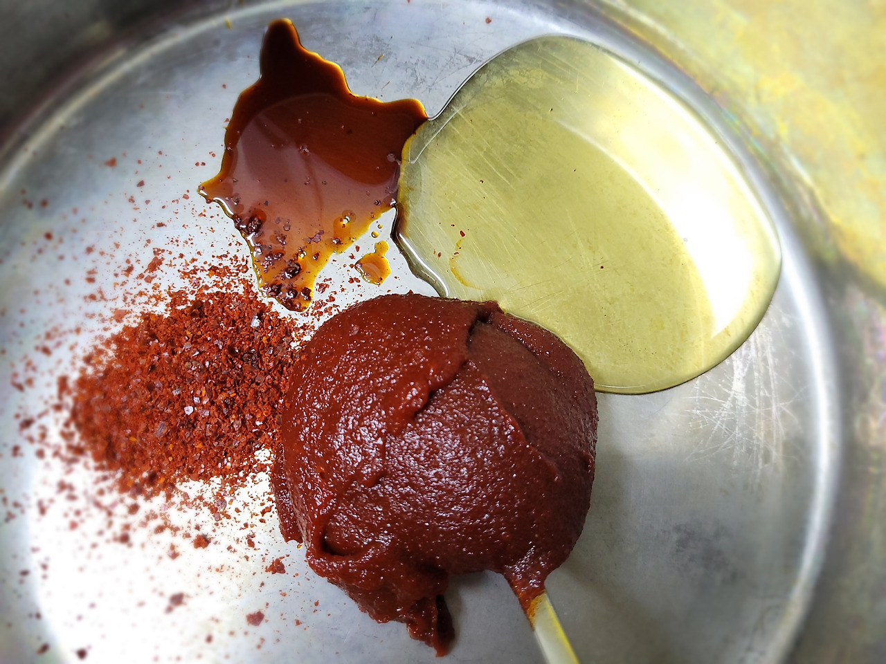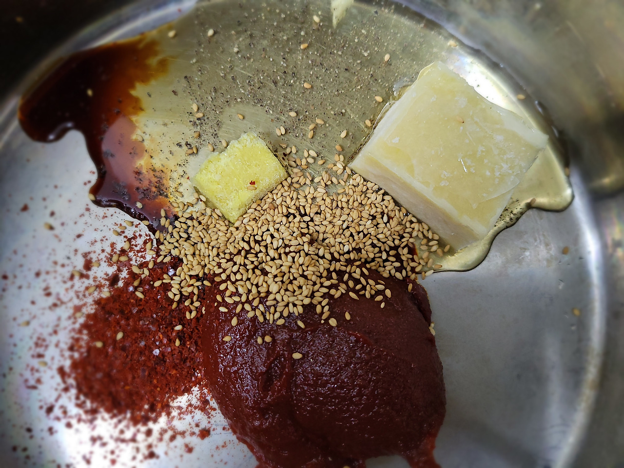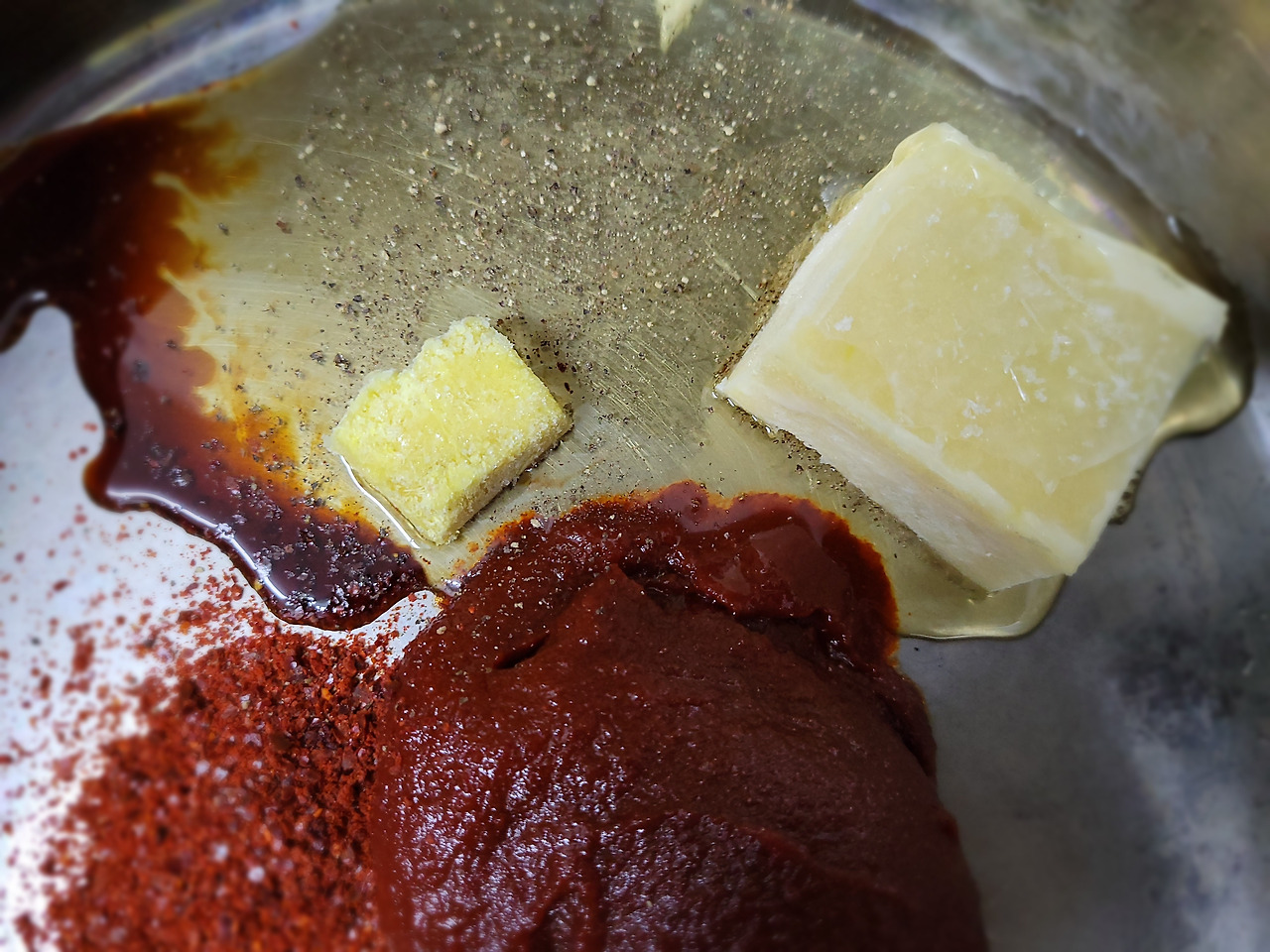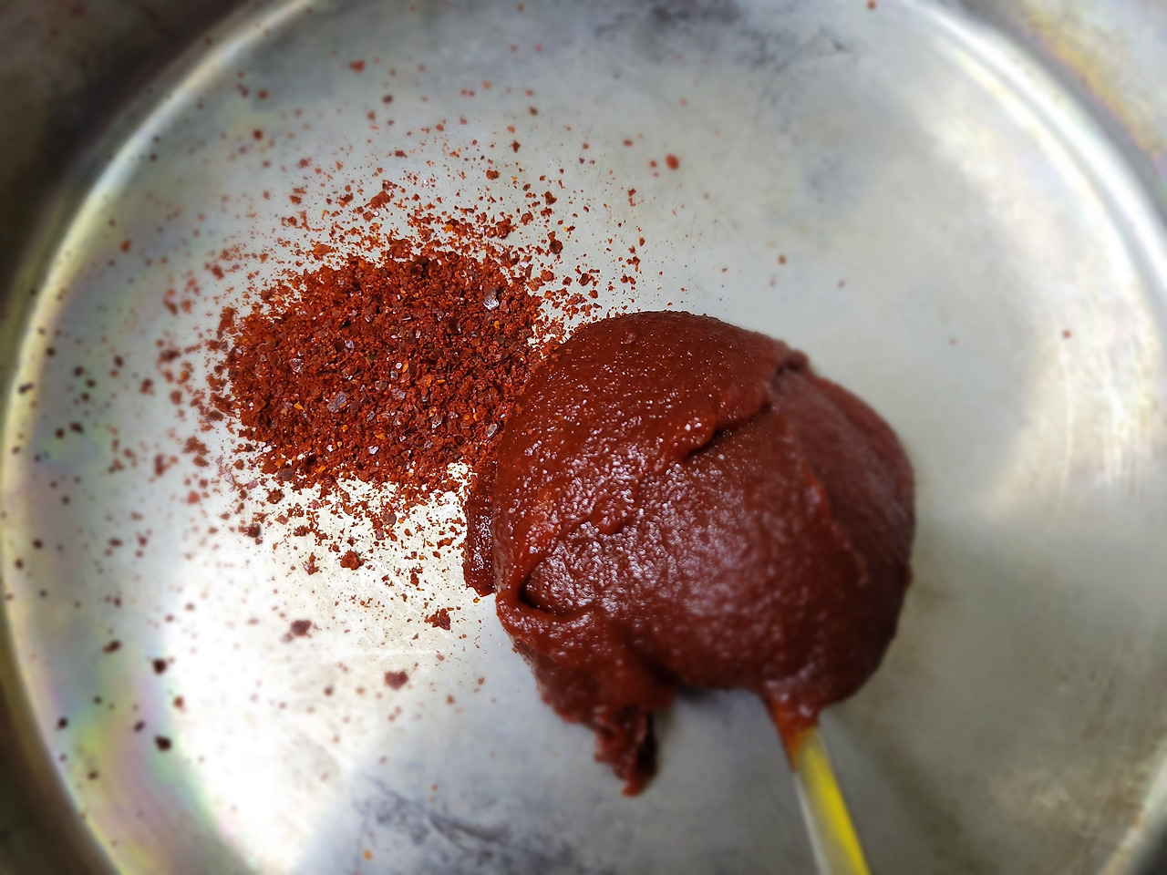 1. 고추장은 넘치도록 크게 떠서 한 숟갈, 고춧가루는 적당량을 냄비에 넣어줍니다.