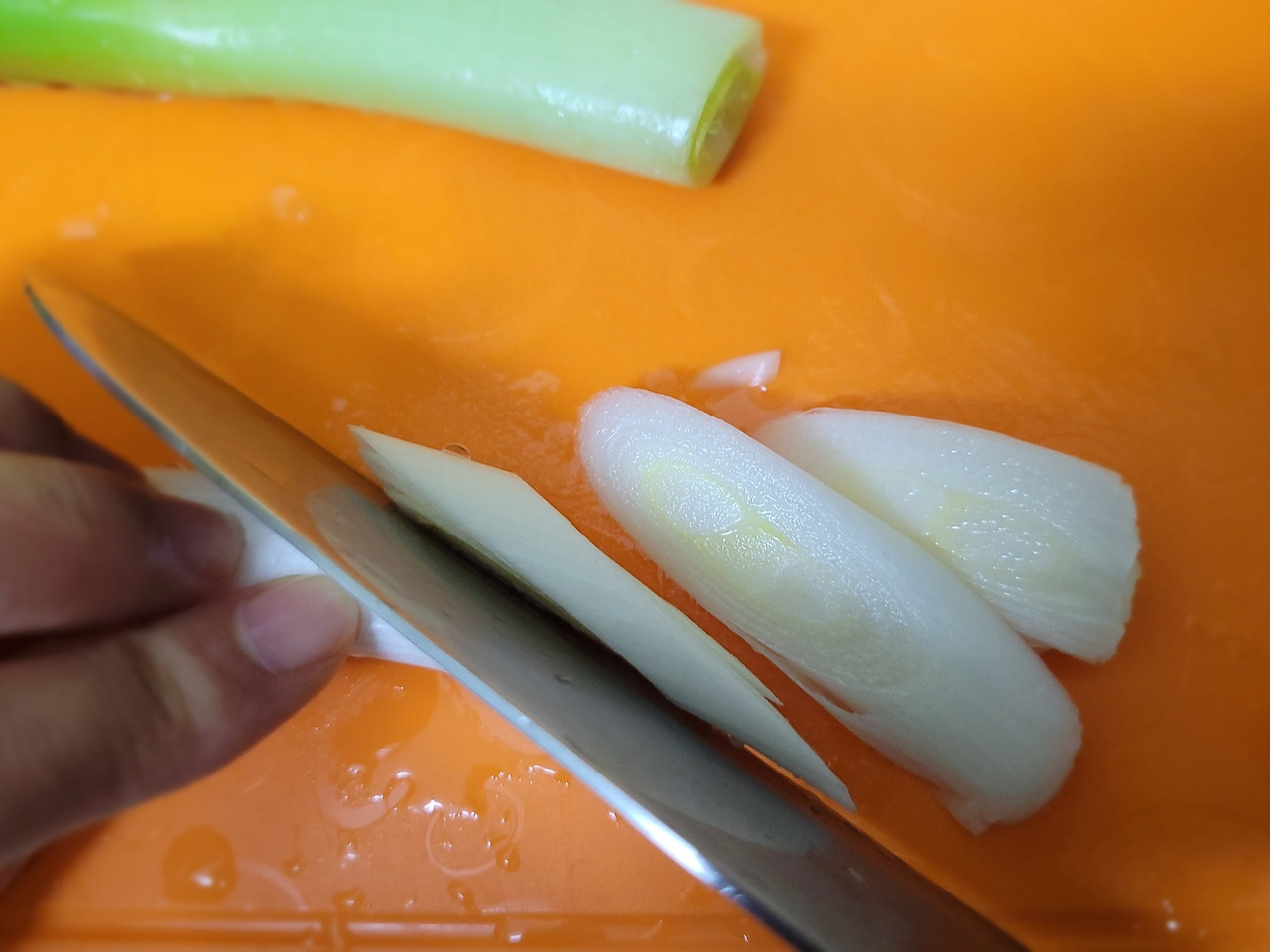 12. 대파는 손질해서 씻어주고, 떡국 떡처럼 어슷썰기 해주세요.