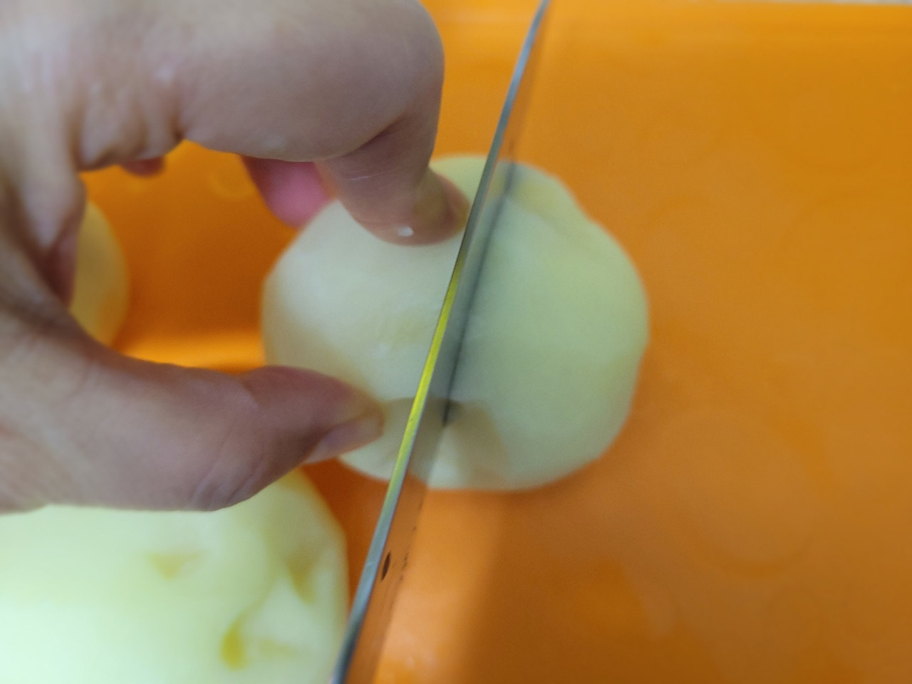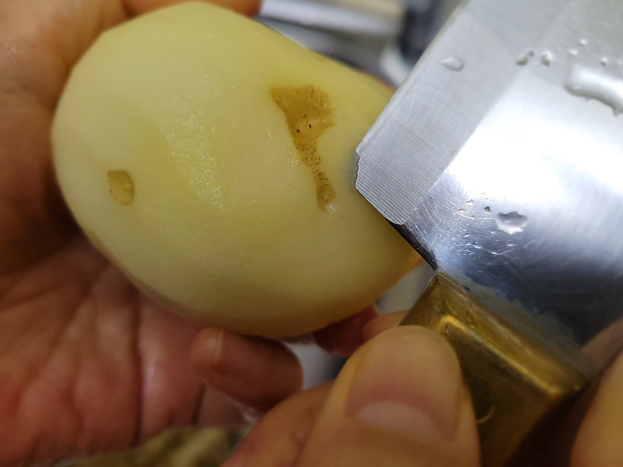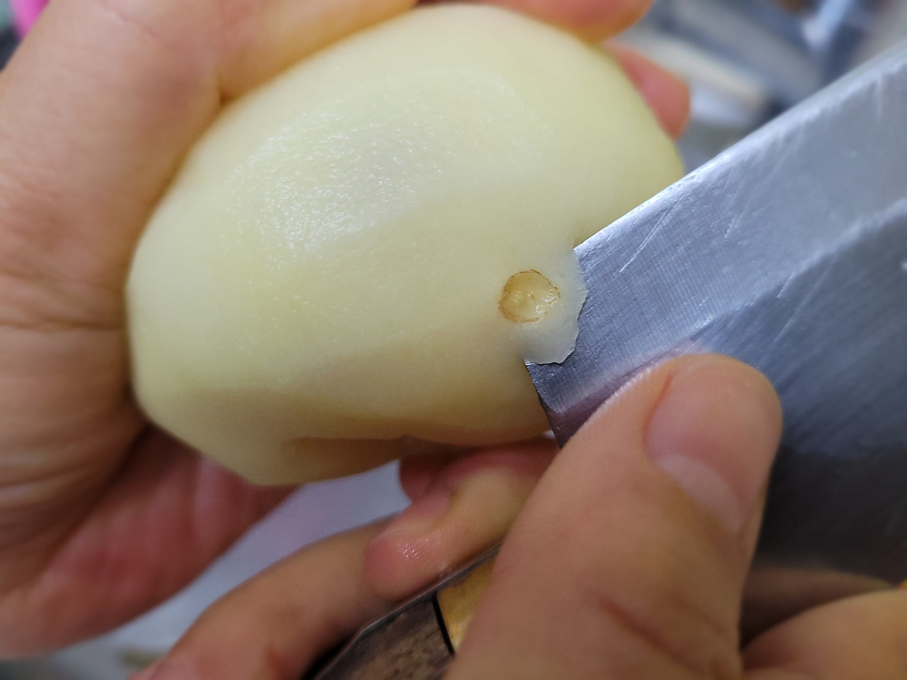 8. 남은 감자 껍질과 파인 부분을 손질해줍니다. 이때 칼의 손잡이 쪽 칼끝을 이용하면 편해요.