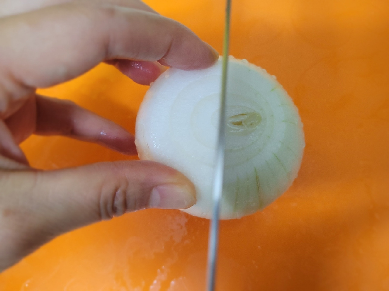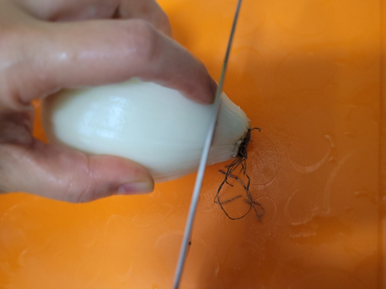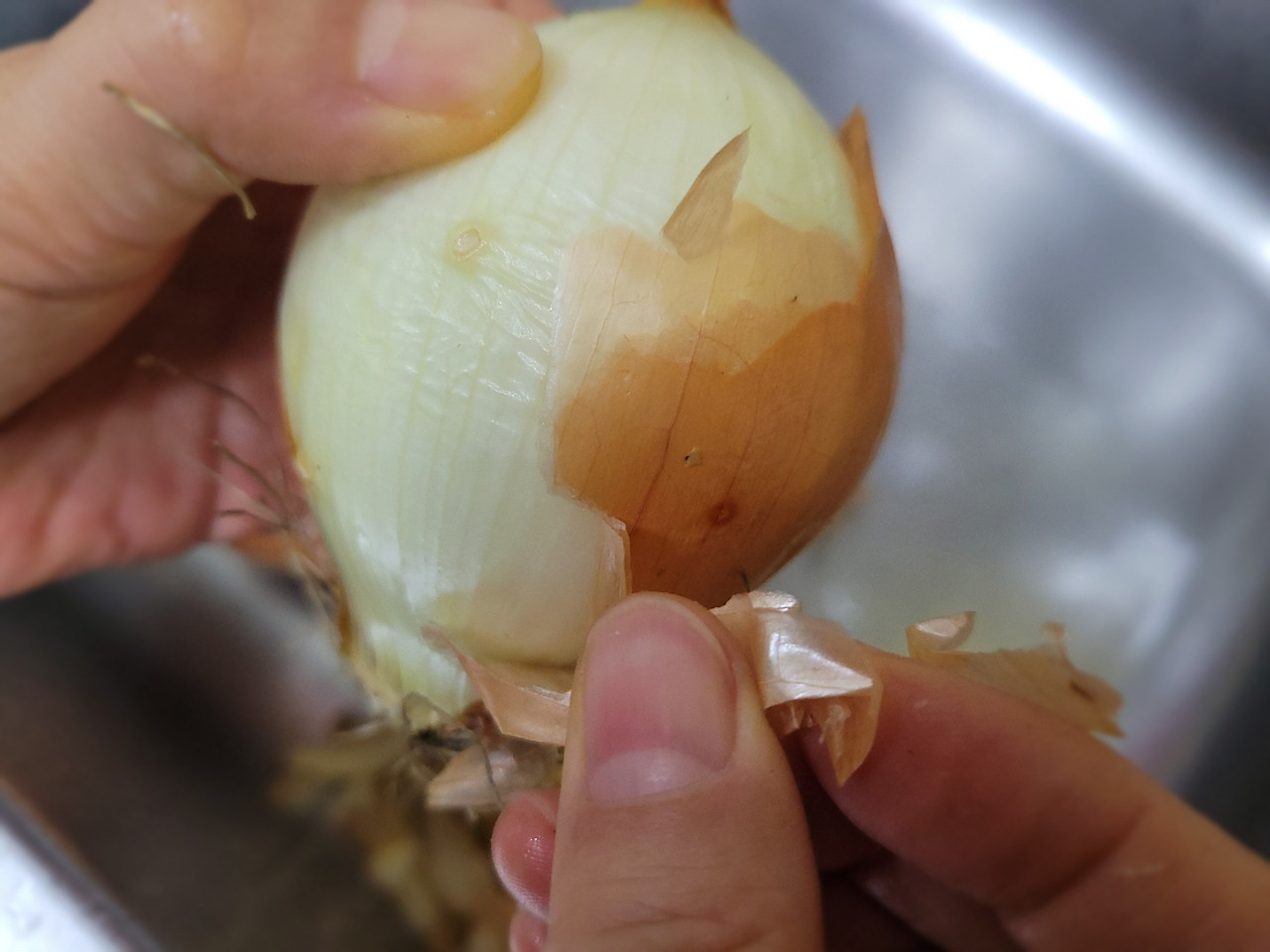10. 이어서 양파 껍질을 벗겨 씻은 뒤, 뿌리와 반대쪽을 잘라줍니다.