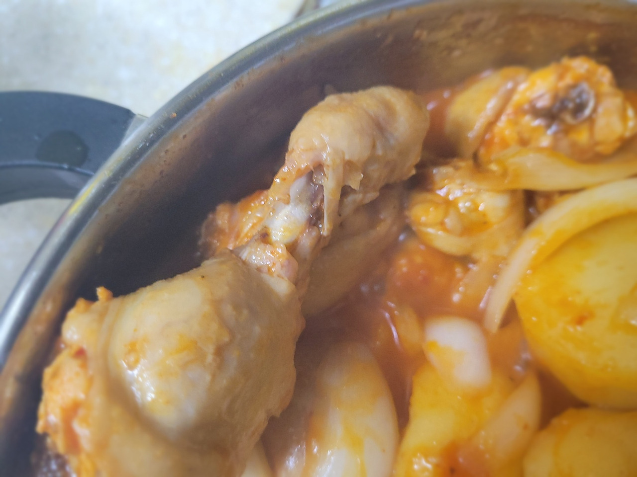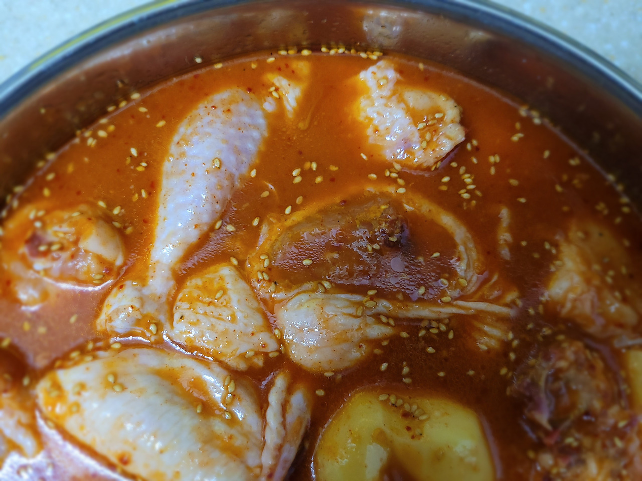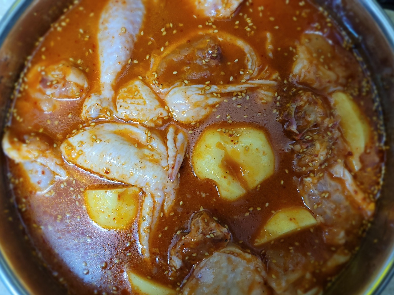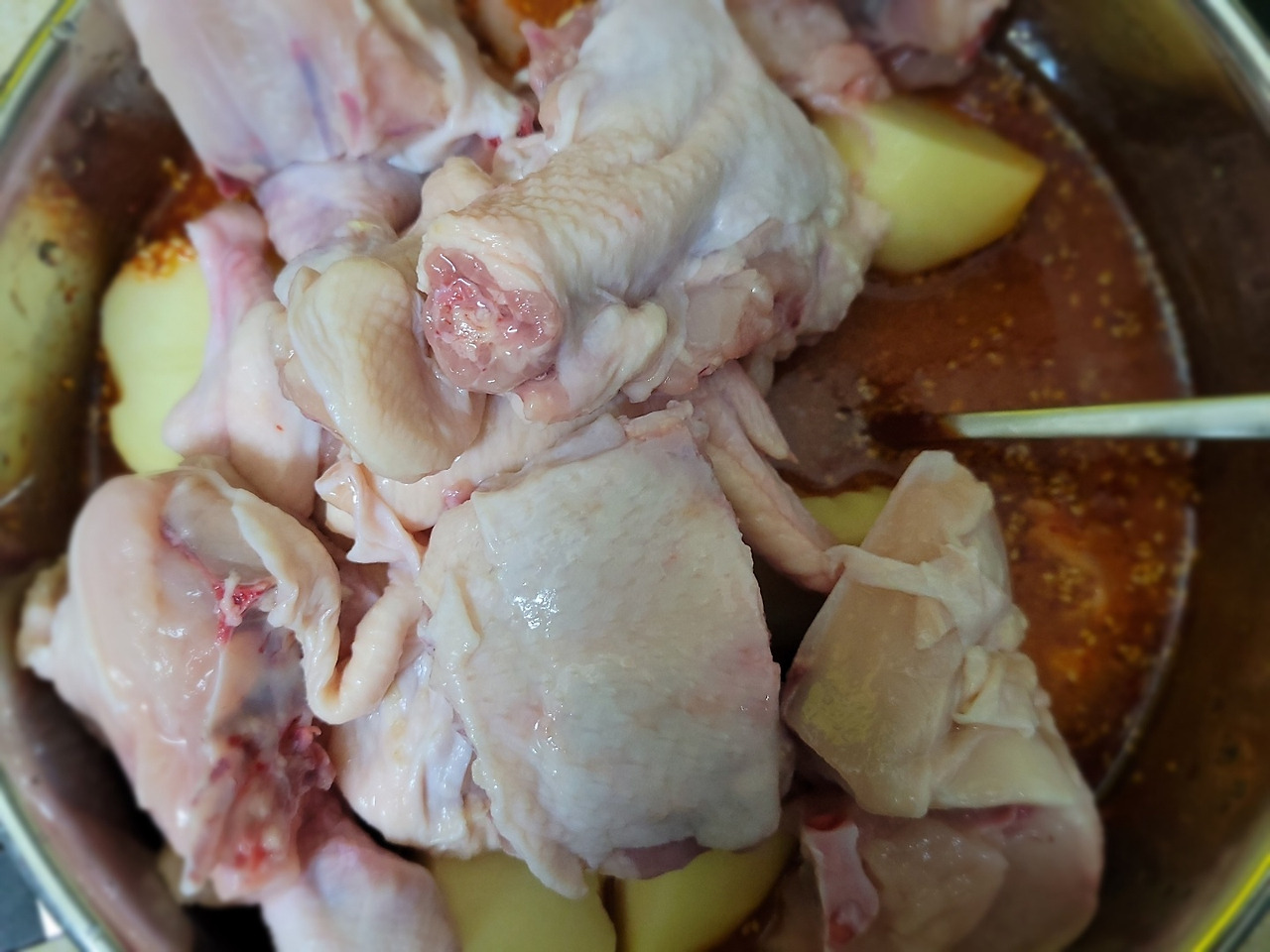 16. 닭고기에 양념을 잘 묻혀줍니다. 고기가 잠길랑 말랑 양념 국물이 충분하면 좋아요.