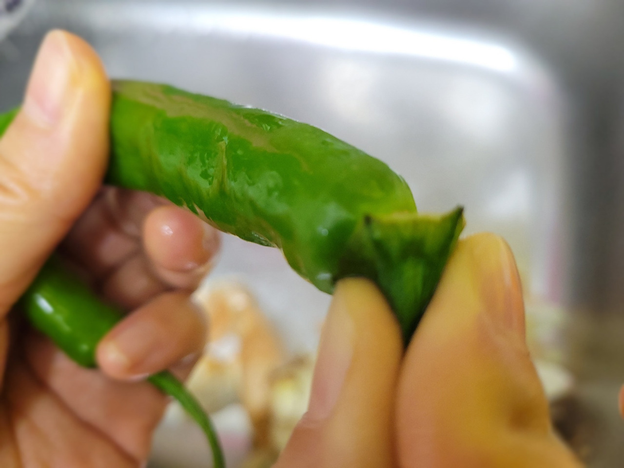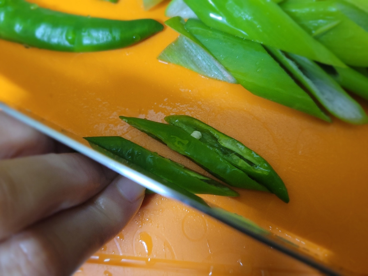 13. 마지막으로 청양고추 꼭지를 똑 따서 씻어준 뒤, 어슷썰기 해줍니다.
