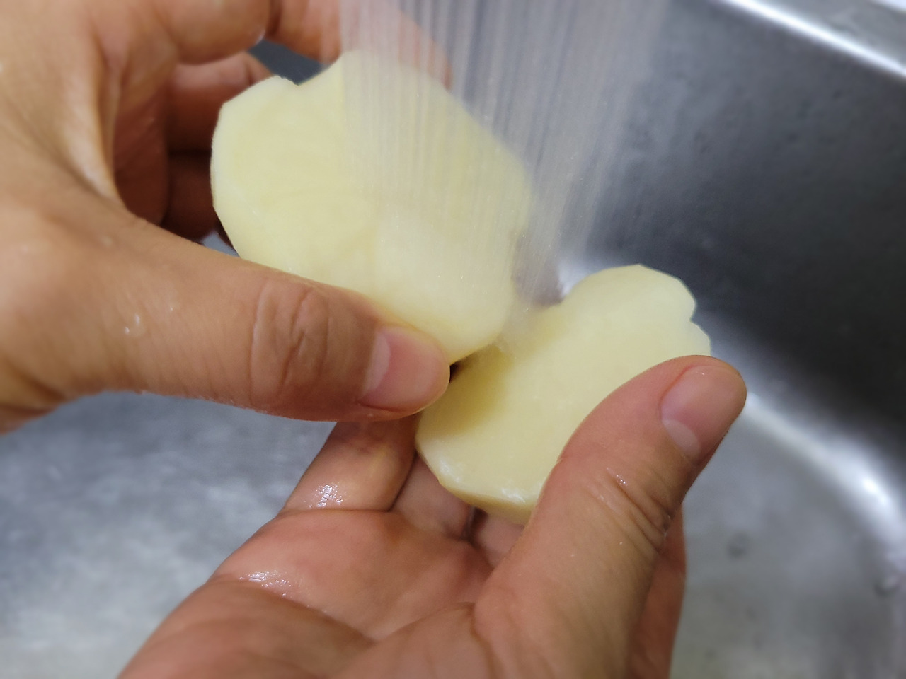 9. 감자를 반으로 자르고, 전분을 씻어내기 위해 다시 한번 씻어줍니다.