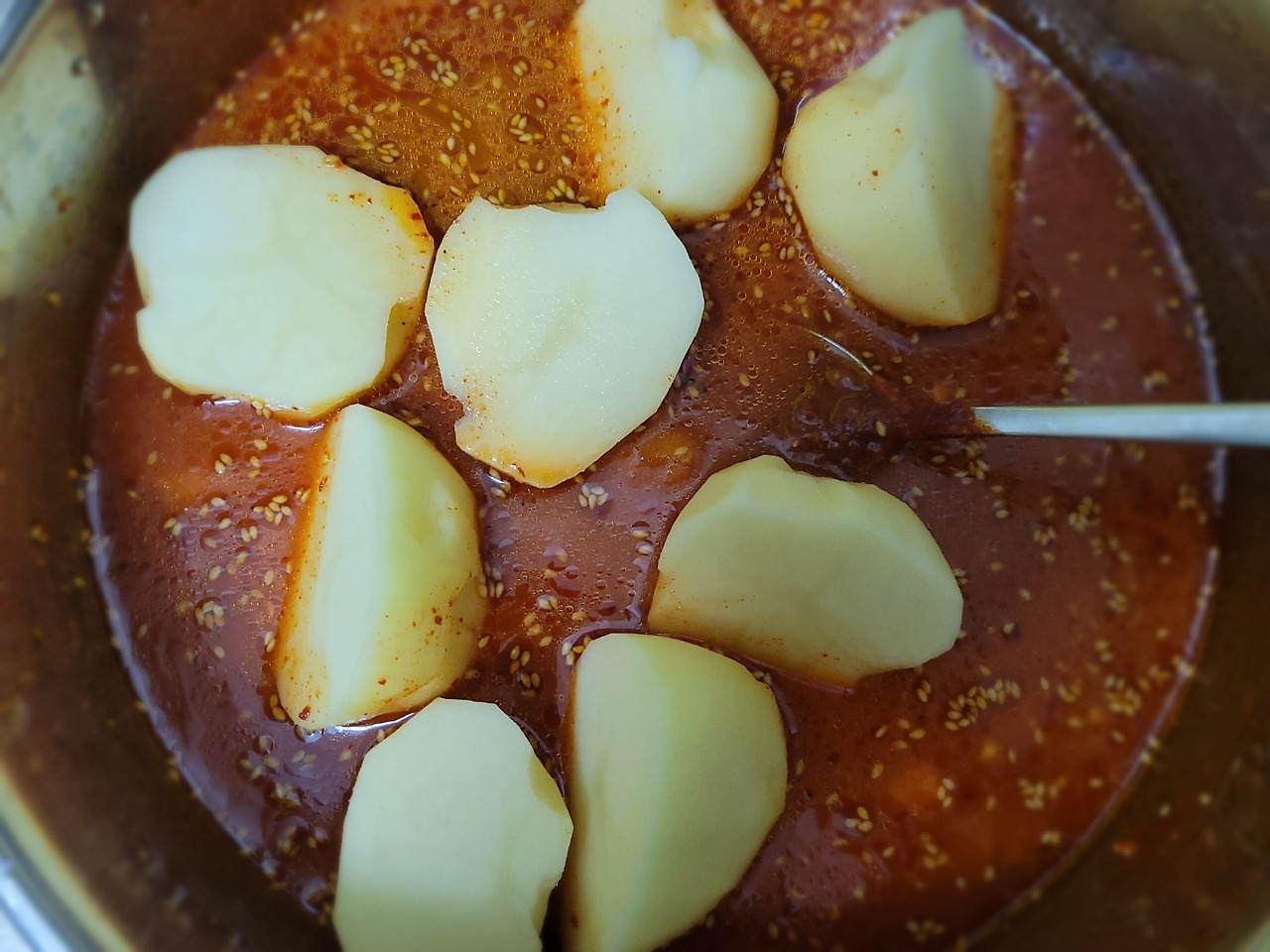 14. 썰어둔 감자를 양념장에 넣어줍니다.