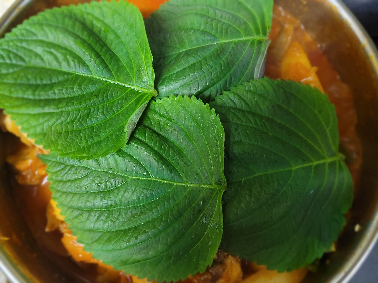 21. 깻잎 4장을 추가해 향만 첨가해줍니다.