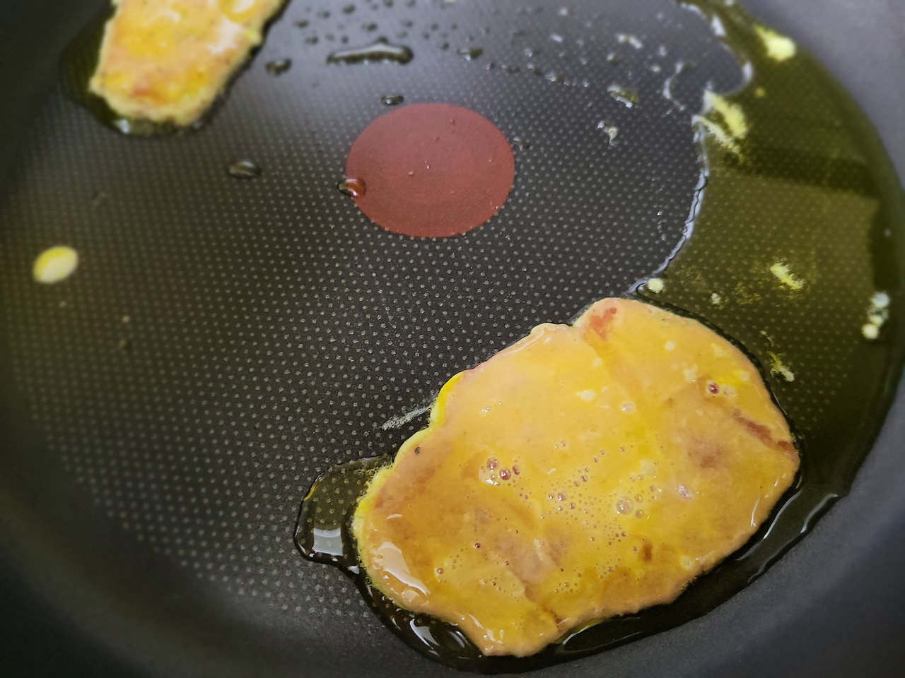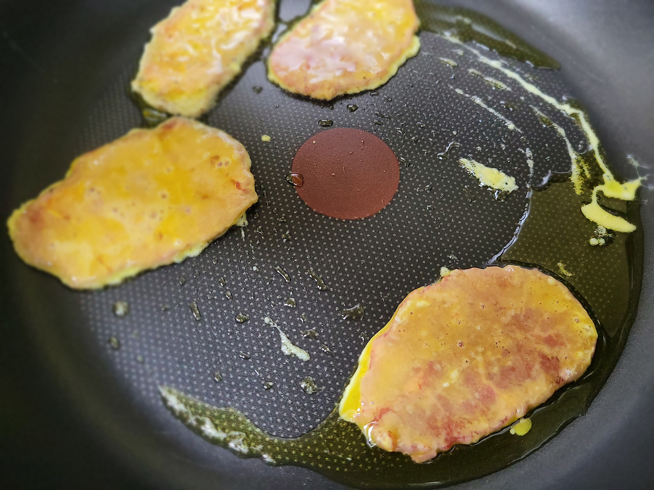 18. 남은 계란물은 지단으로 부쳐줄 거예요. 프라이팬을 닦고 중불로 올려주세요.