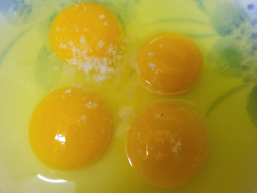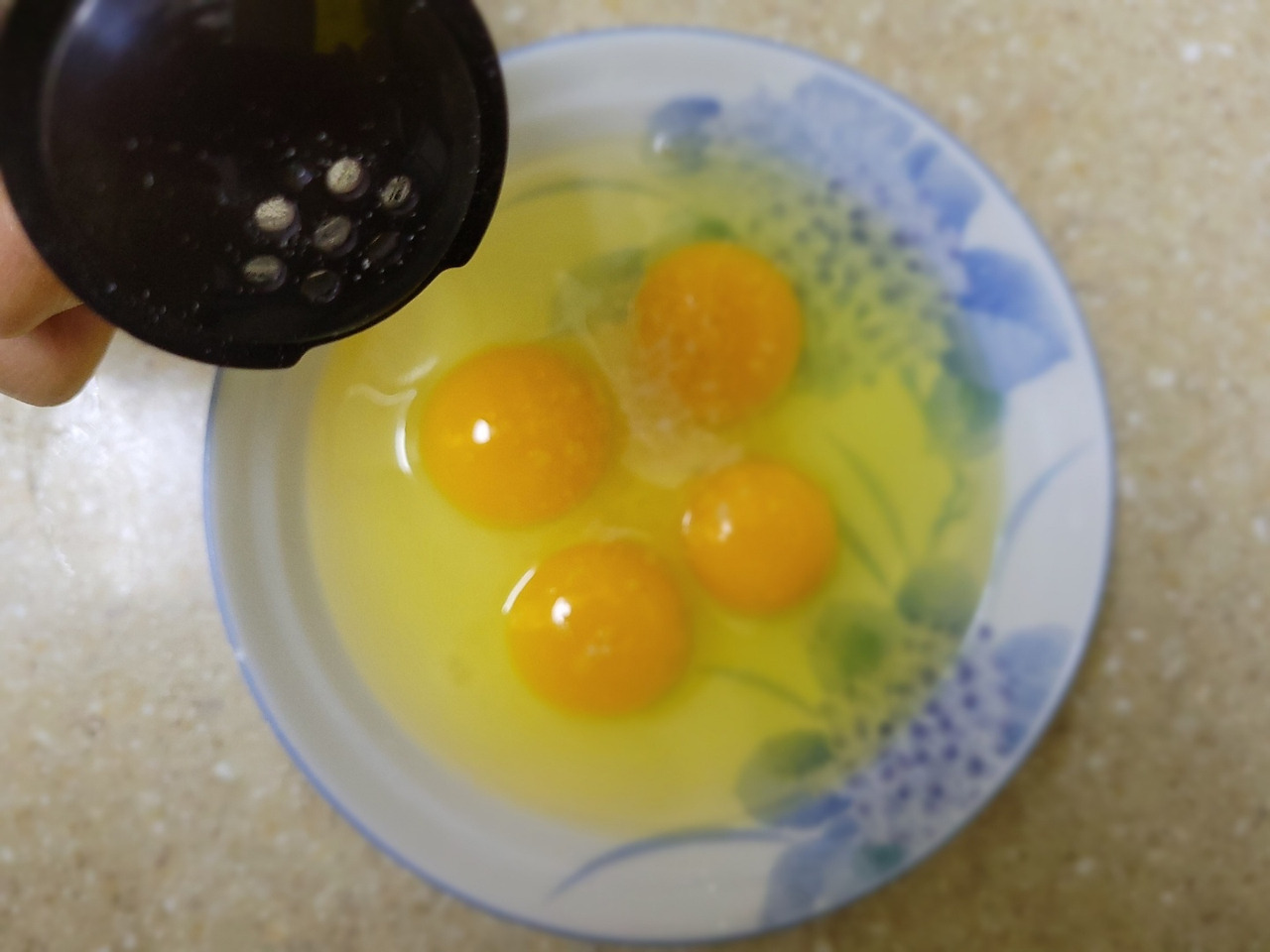 5. 소금과 후추로 계란물 간을 해줍니다. 달걀 하나에 소금은 2.5번, 후추는 조금만 뿌려주세요.