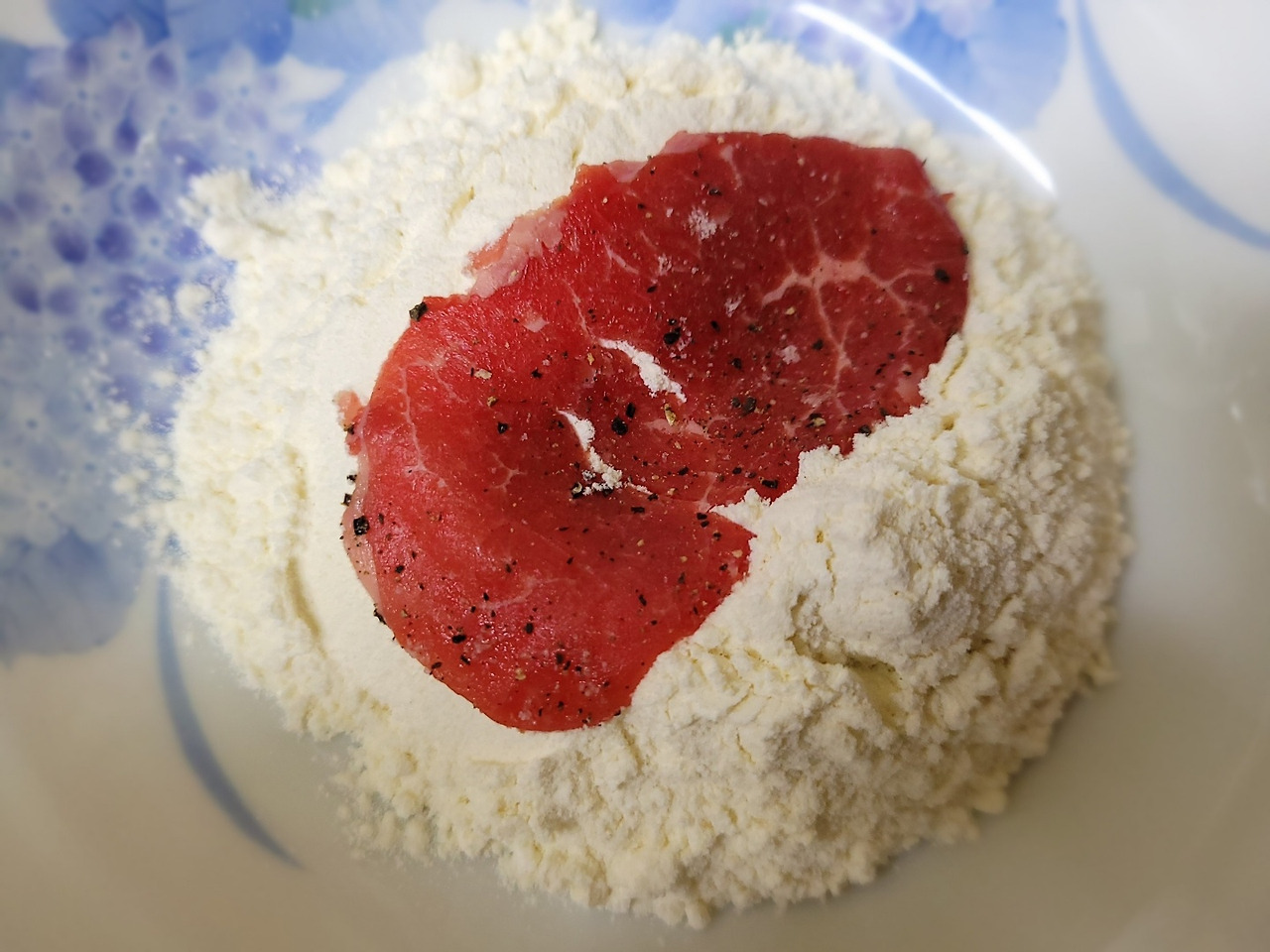 2. 고기를 해동하는 사이, 부침가루를 그릇에 준비합니다.