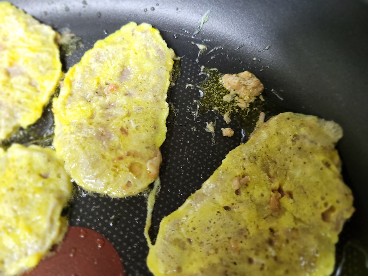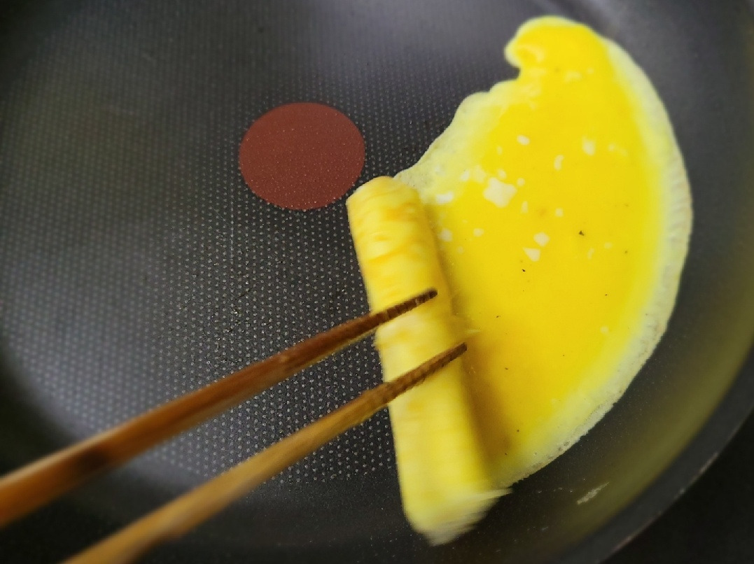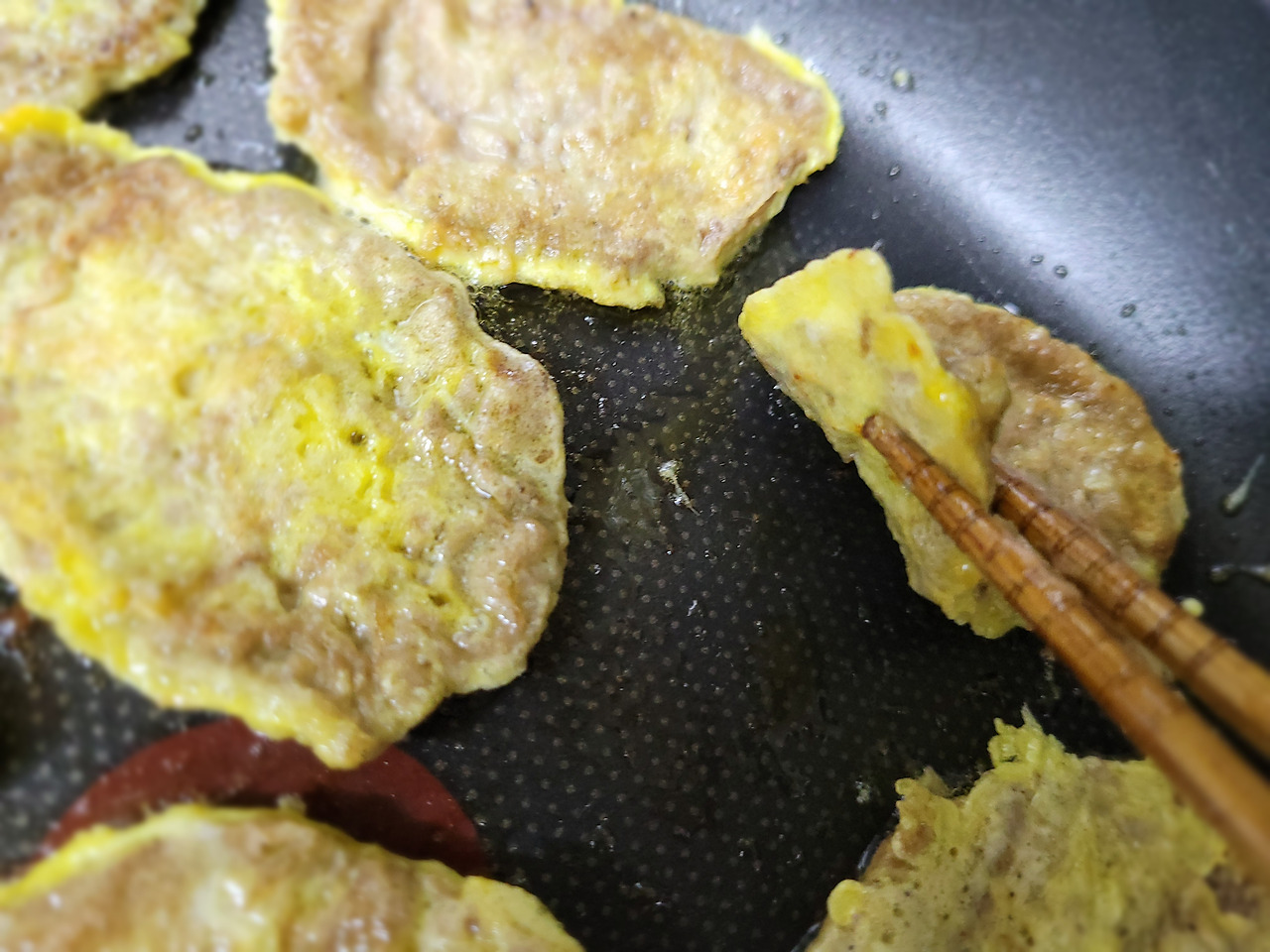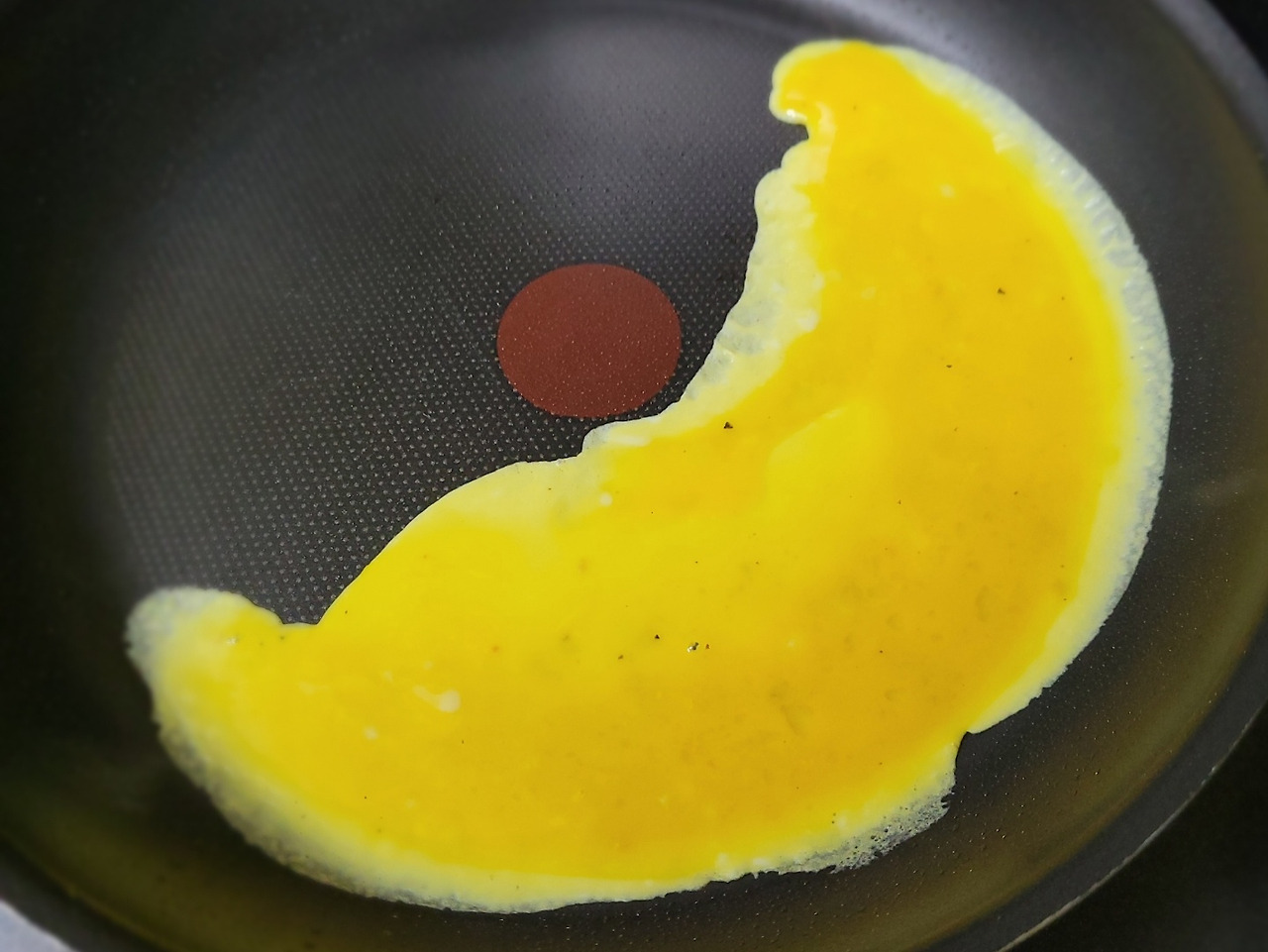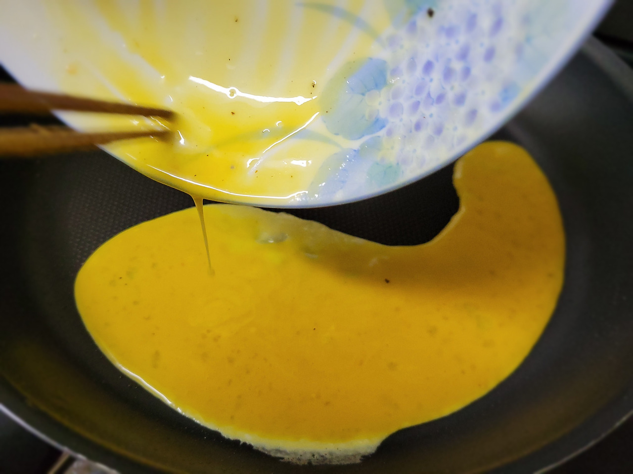 19. 프라이팬에 계란물을 부어줍니다. 얇은 쪽이 익으면 약불로 낮춰주세요.