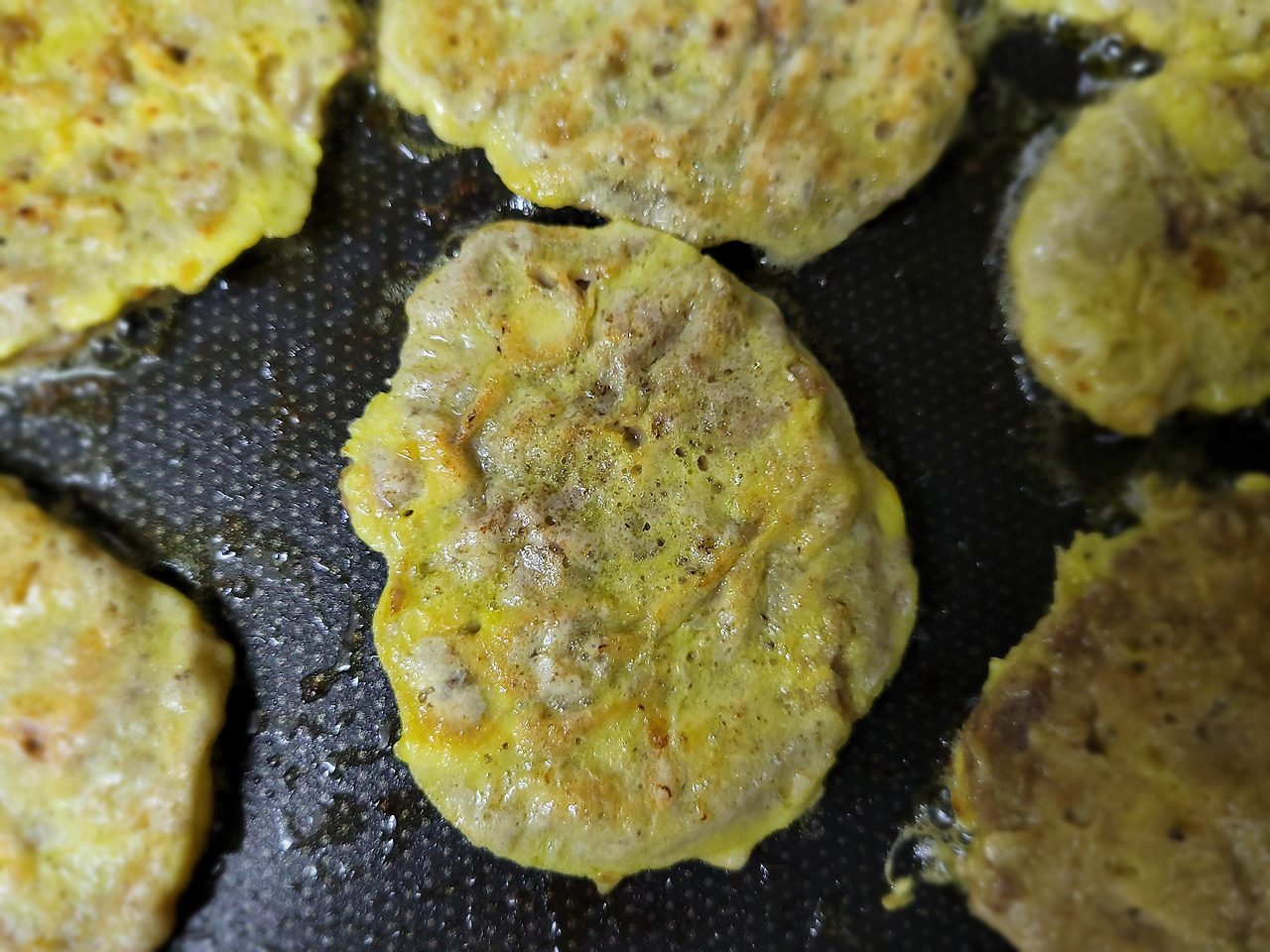 프라이팬 한 판에 부칠 만큼 올려주세요