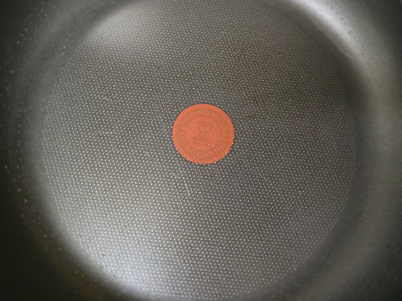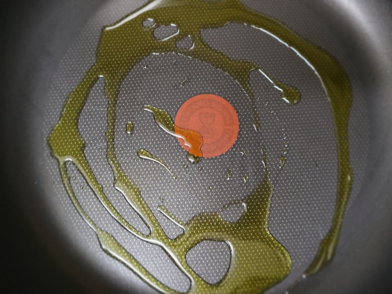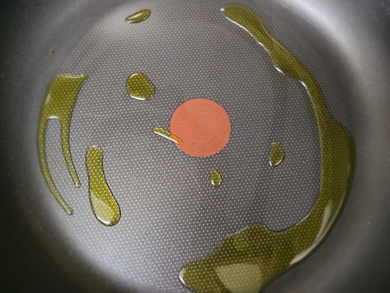 8. 프라이팬을 약불로 1분간 달군 뒤, 프라이팬에 올리브오일을 두릅니다.
