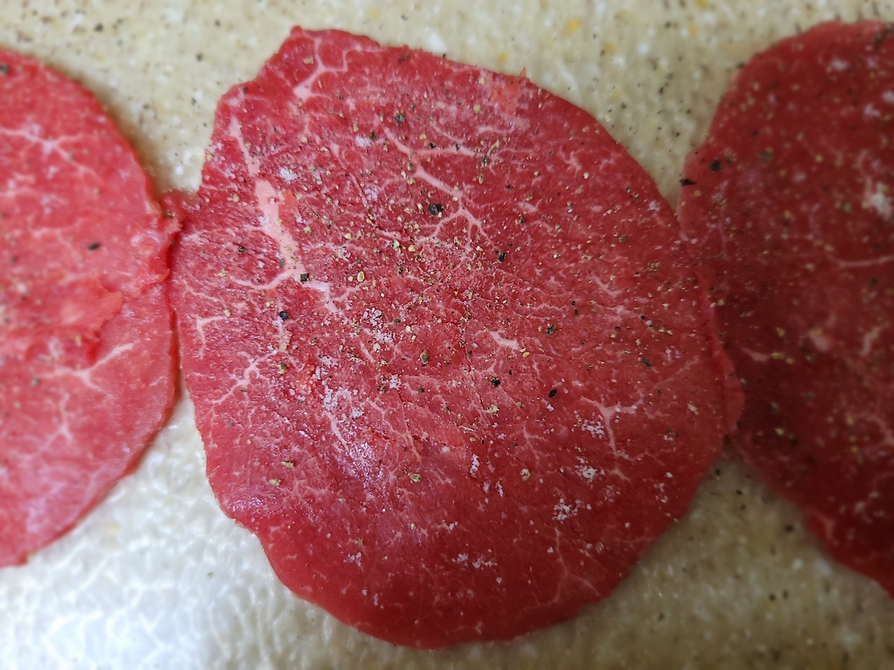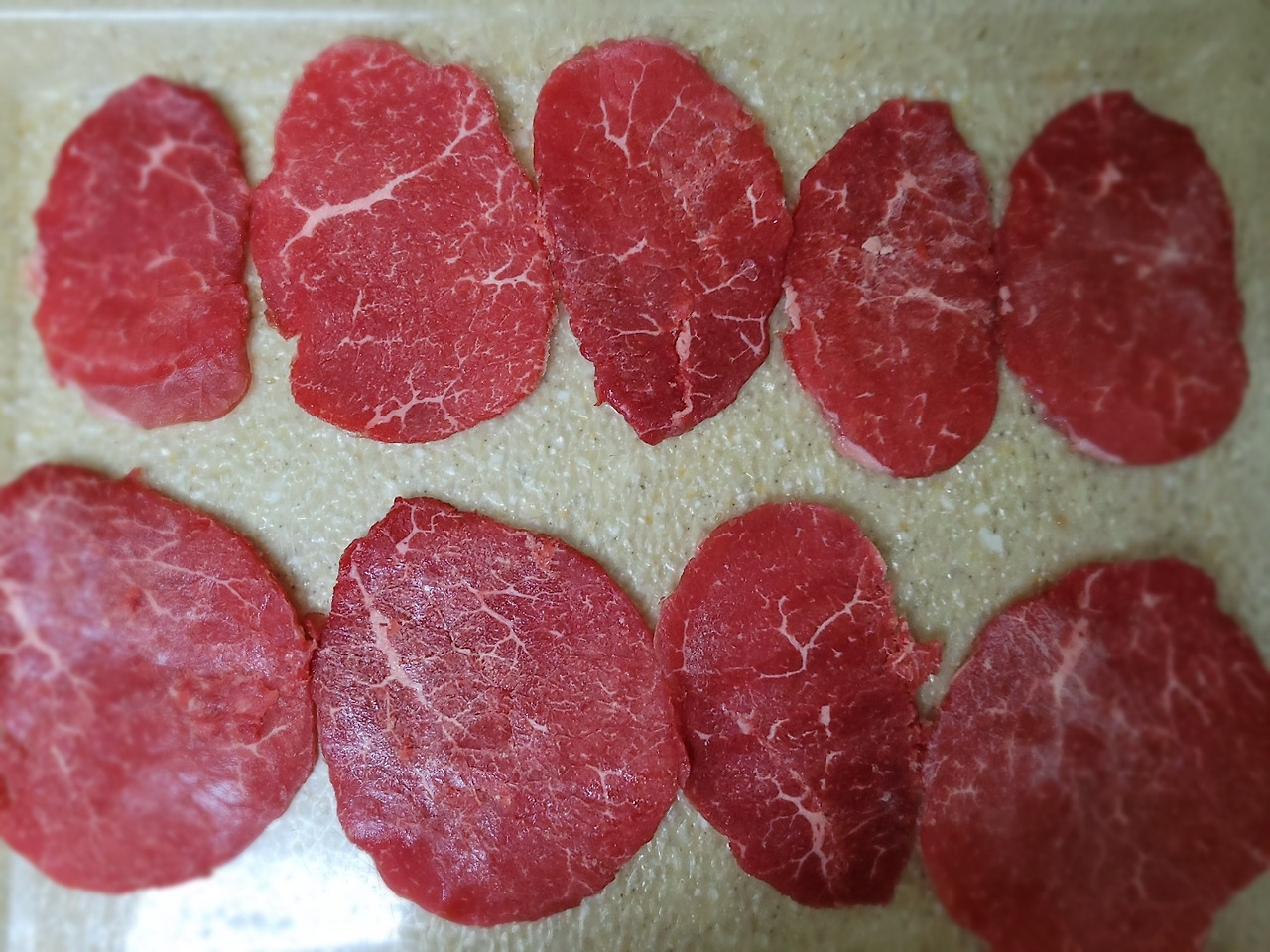 6. 해동된 고기를 한 장씩 떼서 쟁반 위에 펼쳐놓습니다.