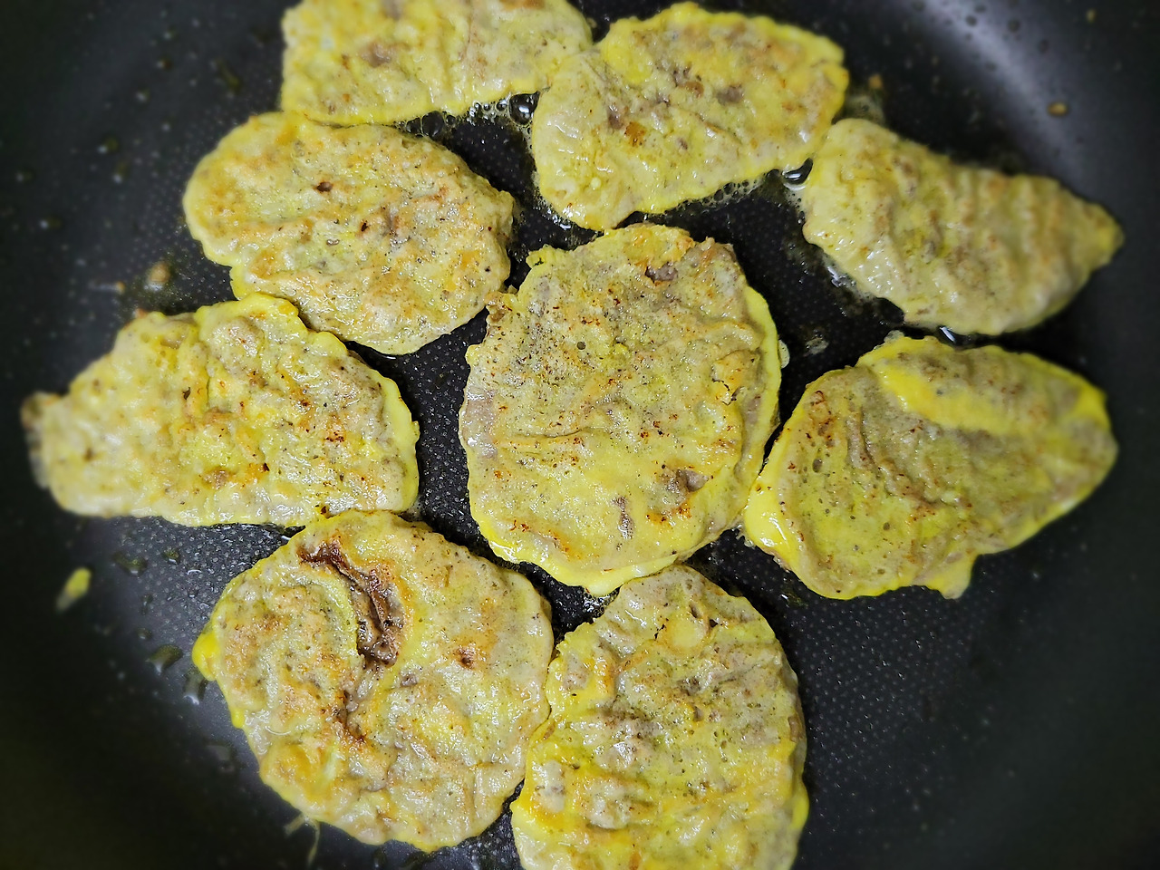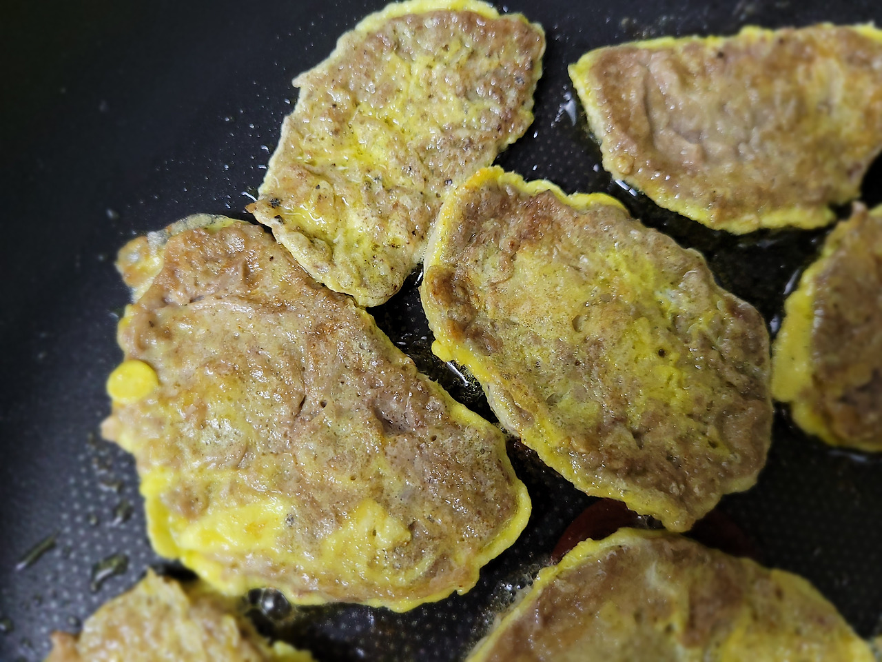 약불로 천천히 공들여 부친 덕분에 모양도 맛도 깔끔합니다. 옛말에 어른들은 전을 먹기 좋게 부치는 걸, 전을 얌전히 부친다고 표현했다고 합니다. 고기전이 맛있을 거란 건 풍겨오는 고기 냄새만 맡아도 알지만, 그에 못지않게 먹음직스러운 비주얼에 자꾸만 손이 가네요.