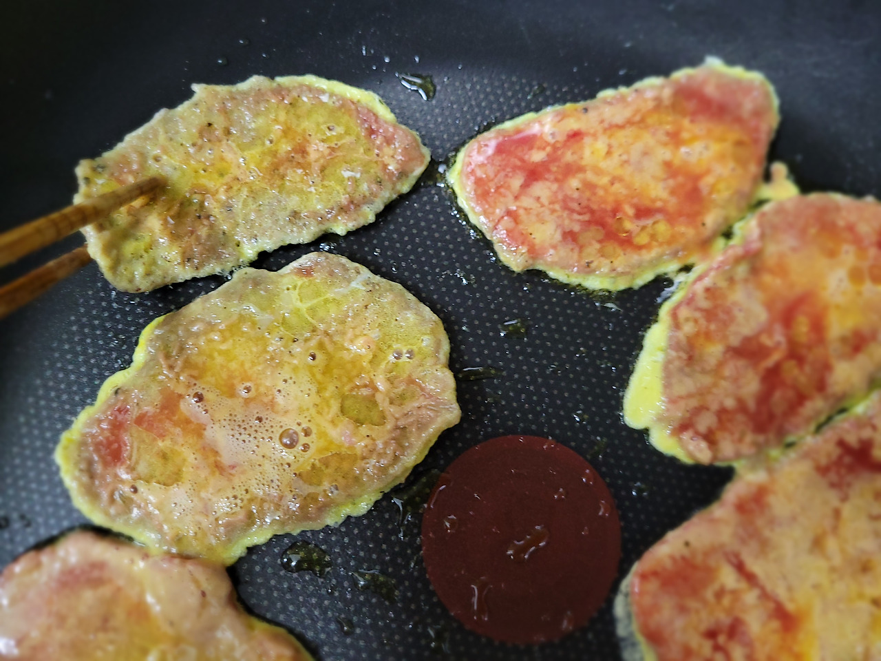12. 전은 총 3번 뒤집어줄 거예요. 먼저 핏기가 가셨을 때 한 번 뒤집어줍니다.
