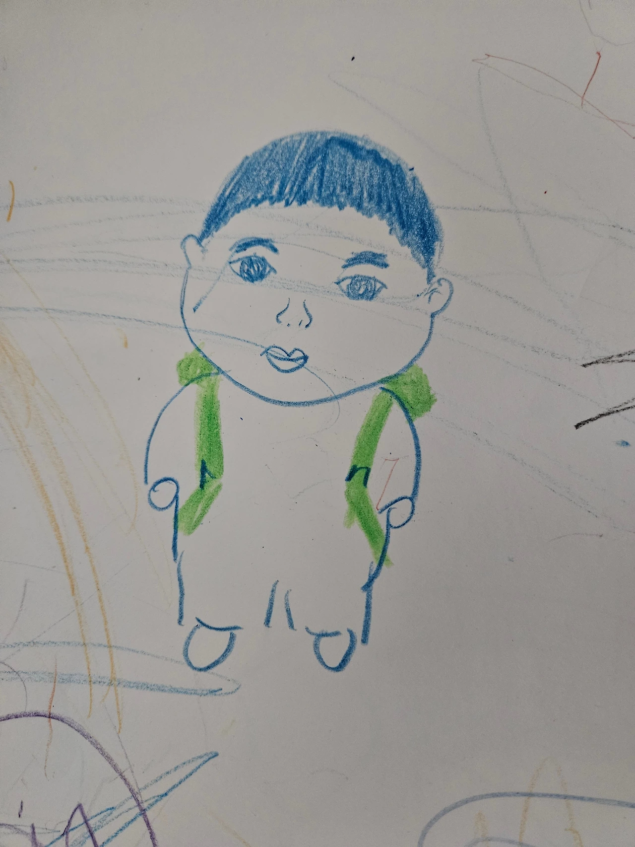 집히는 대로 든 크레스파스의 색깔은 파란색이었습니다. 제가 좋아하는 색깔입니다. 아들의 머리부터 시작해서 귀 얼굴을 그립니다. 숱 많은 아기 머리카락은 빽빽하게 채우고 라인이 잡힌 눈썹과 맑고 처진 순한 눈, 도톰한 콧방울과 톡 하고 튀어나온 입술을 그립니다. 짧은 몸과 팔다리는 쓰윽쓰윽-. 마지막으로는 어린이집 가는 대견한 아들의 필수템 어린이집 가방을 메어 줍니다. 어린이집 가방은 색깔을 바꾸어 연두색으로 포인트를 주었습니다. 완성입니다.