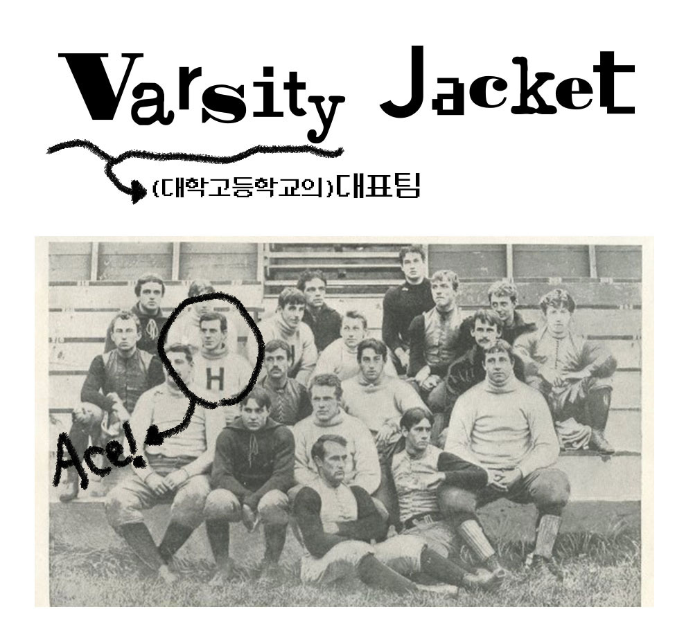 미국 동부의 상류층 자제들이 즐겨 입는 스타일을 ‘프레피 룩(Preppy look)'이라고 한다. 바시티 재킷도 그중 하나인데 그 시작은 하버드 대학교 야구팀이 에이스를 표시하기 위해 ‘H’를 유니폼에 박은 것. 추후 우리가 아는 울 소재 몸판에 가죽 소매인 재킷으로 발전한 게 바로 바시티 재킷(Varsity jacket)이다.