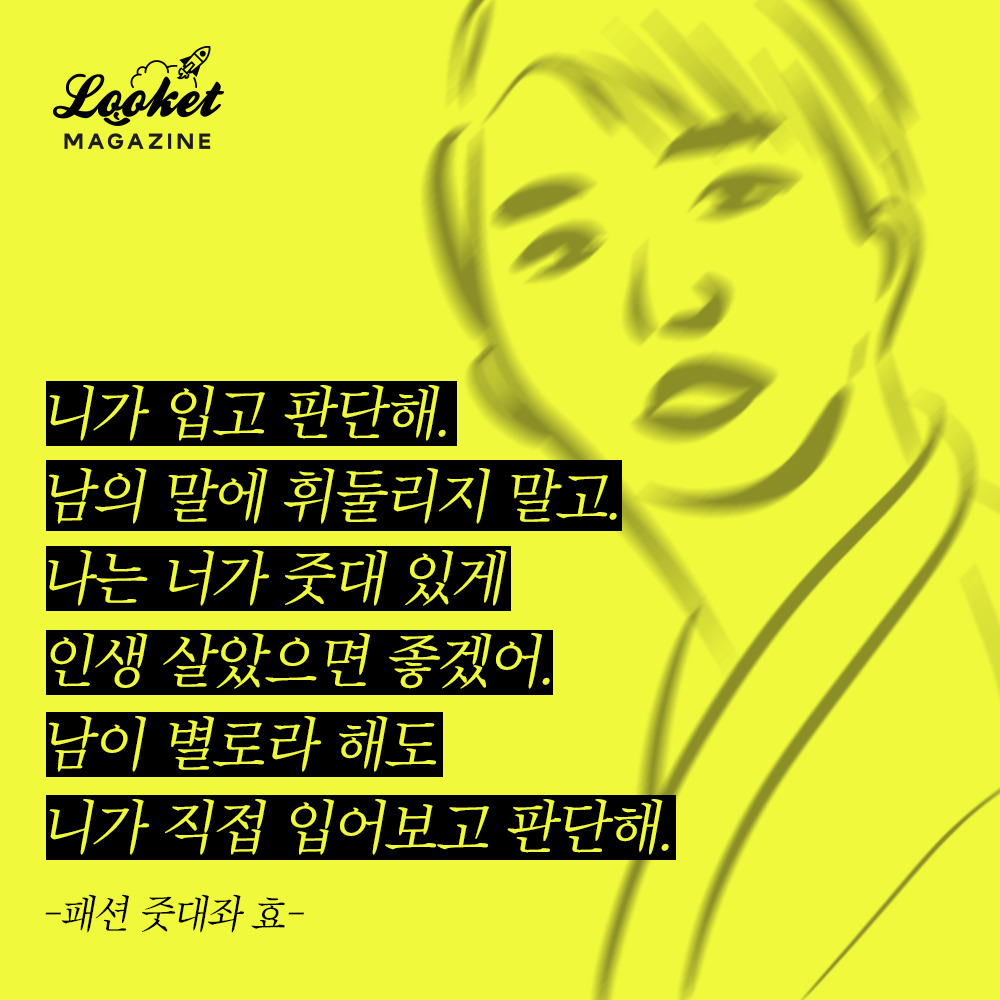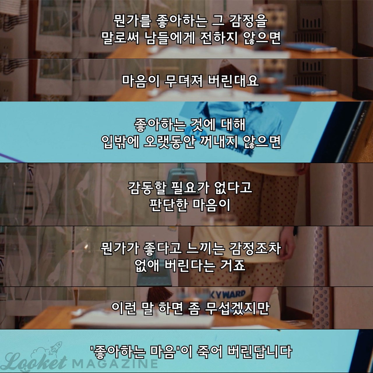 드라마 속 대사를 빌려, 좋아하는 마음을 맘껏 내비치지 않으면 스스로 감동할 필요가 없다고 판단해서 그 마음이 사라져 버린다고 한다. 그래서 팔불출을 자처해서라도 옷을 좋아하는 이 마음을 오래 간직하고 싶다. ‘왜냐면, 내가 옷을 많이 좋아하기 때문에.’