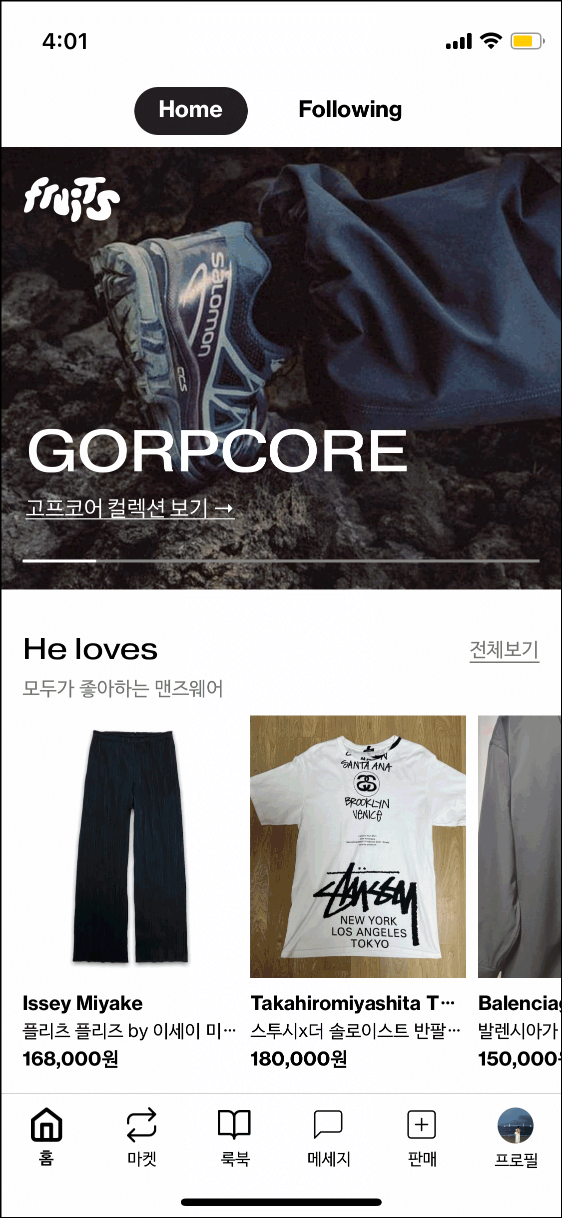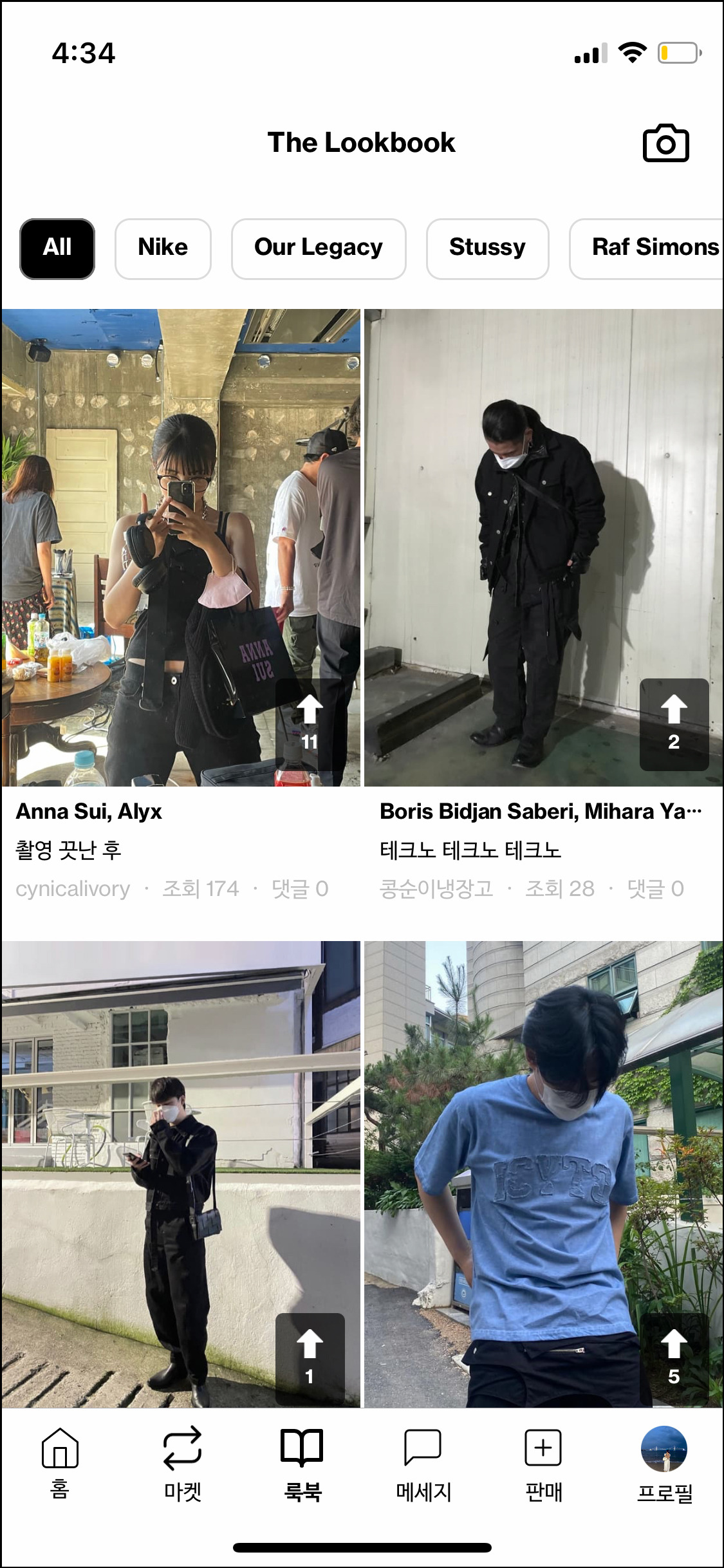 개인적으로 좋았던 건 유저가 올리는 룩북 페이지. 직접 찍은 스냅을 구경하는 맛이 있고 취향에 맞는 판매자를 발견해서 팔로우하면 홈 화면에서 바로 소식을 확인할 수 있어서 편하다.