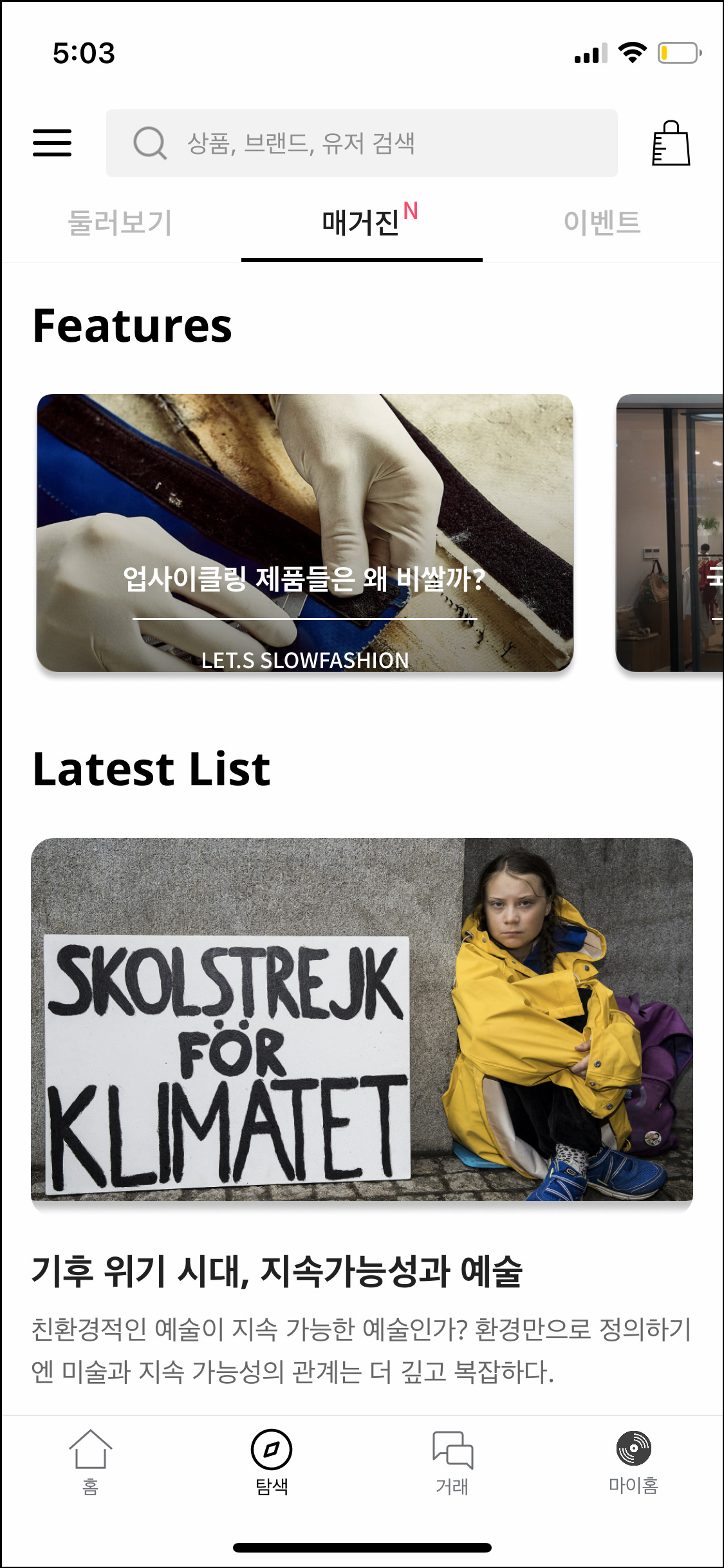 매거진 탭을 통해 지속가능성에 대한 콘텐츠를 제공하는 등 환경문제에도 진심인 서비스.