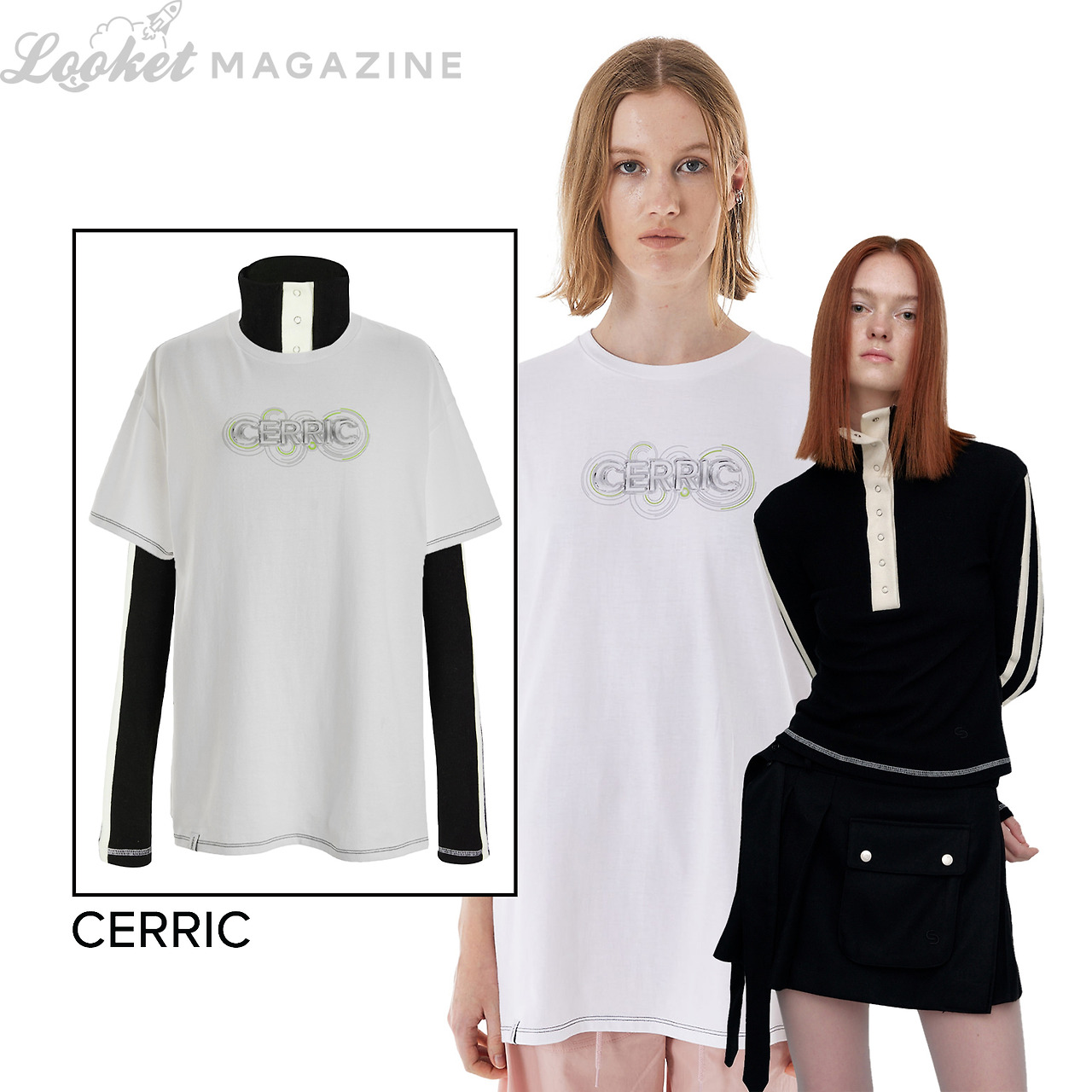 블랙 앤 화이트는 흔한 조합이지만 디테일이 있는 아이템을 선택하면 위트 있는 무채색 룩을 연출할 수 있다. 세릭의 아이템을 활용한 조합은 반소매의 스티치 포인트, 폴라티의 라인 디자인과 소매 마감 등이 원래 한 벌의 옷인 것처럼 묘하게 잘 어우러진다.