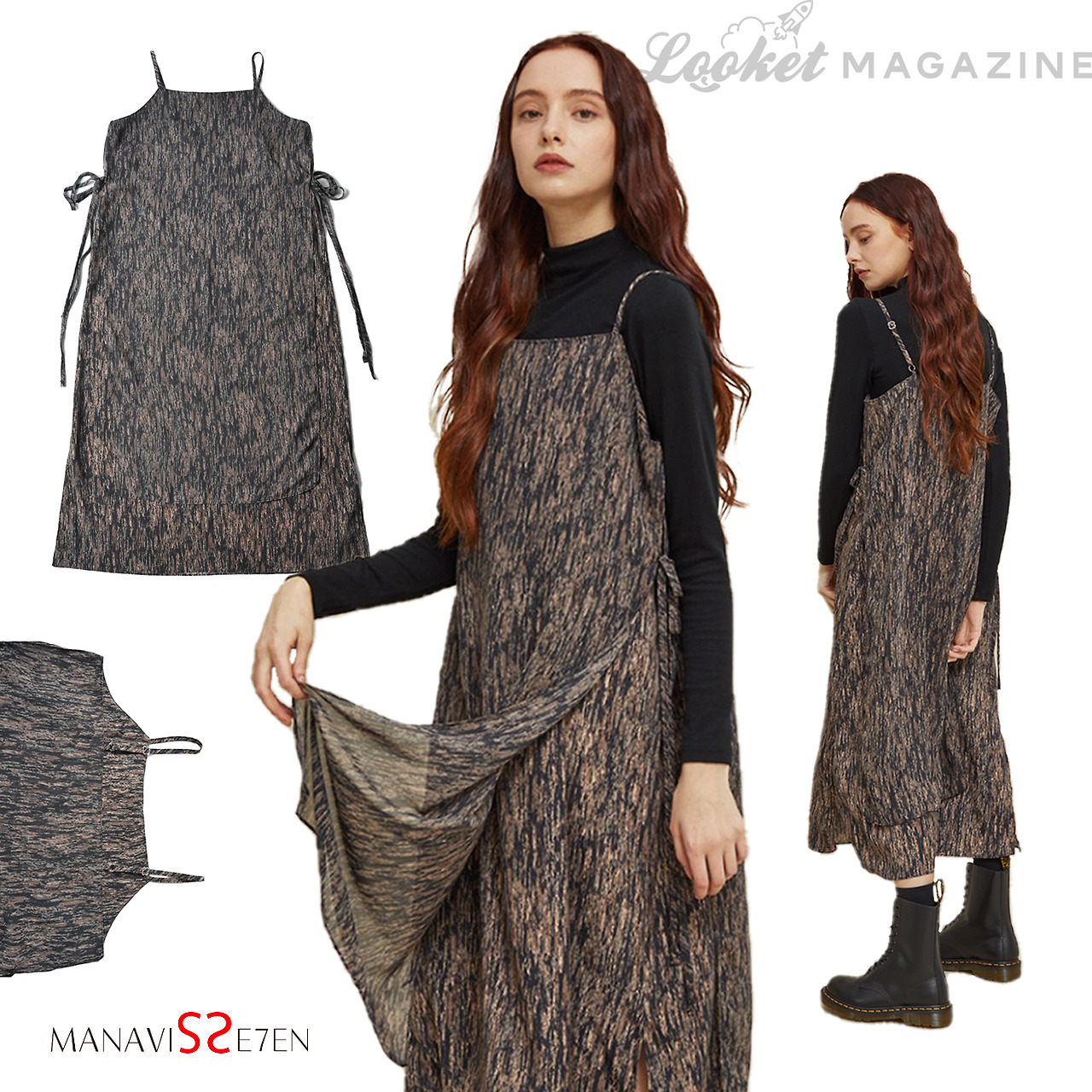 원피스를 포인트 아이템으로도 활용해 보자. 마나비스세븐의 원피스는 잔잔한 패턴이 눈을 사로잡으며, 쉬폰 재질이 바람에 살랑거리는 매력이 있다. 너무 가볍게만 보이지 않는 컬러가 겨울의 무드에도 잘 어우러져 추천한다.