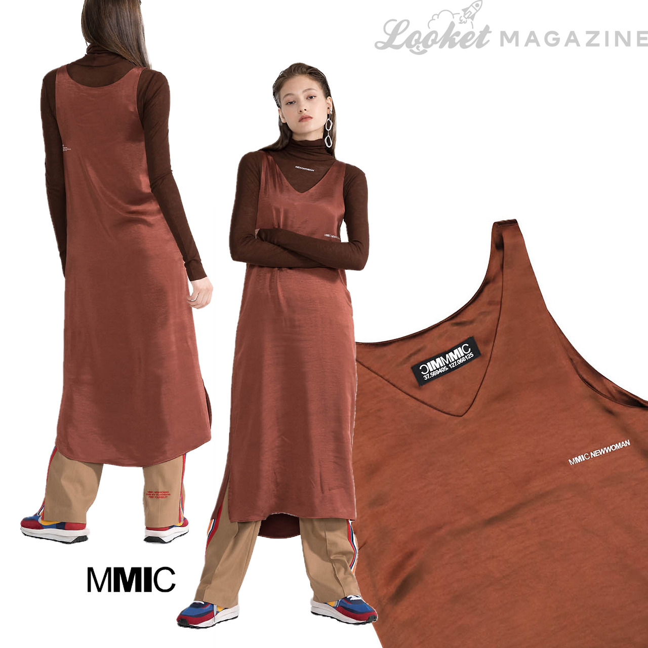 은은하게 광택이 도는 브라운 컬러의 새틴 원피스라면 신비스러움과 겨울다움, 두 마리 토끼를 다 잡을 수 있을 것이다. 디자인 요소를 최대한 덜어내어 소재의 특성을 강조했고, 적당히 파인 브이넥도 부담스럽지 않다. 군더더기 없이 깔끔한 스타일로 어디에나 잘 어울리는 만능 아이템.