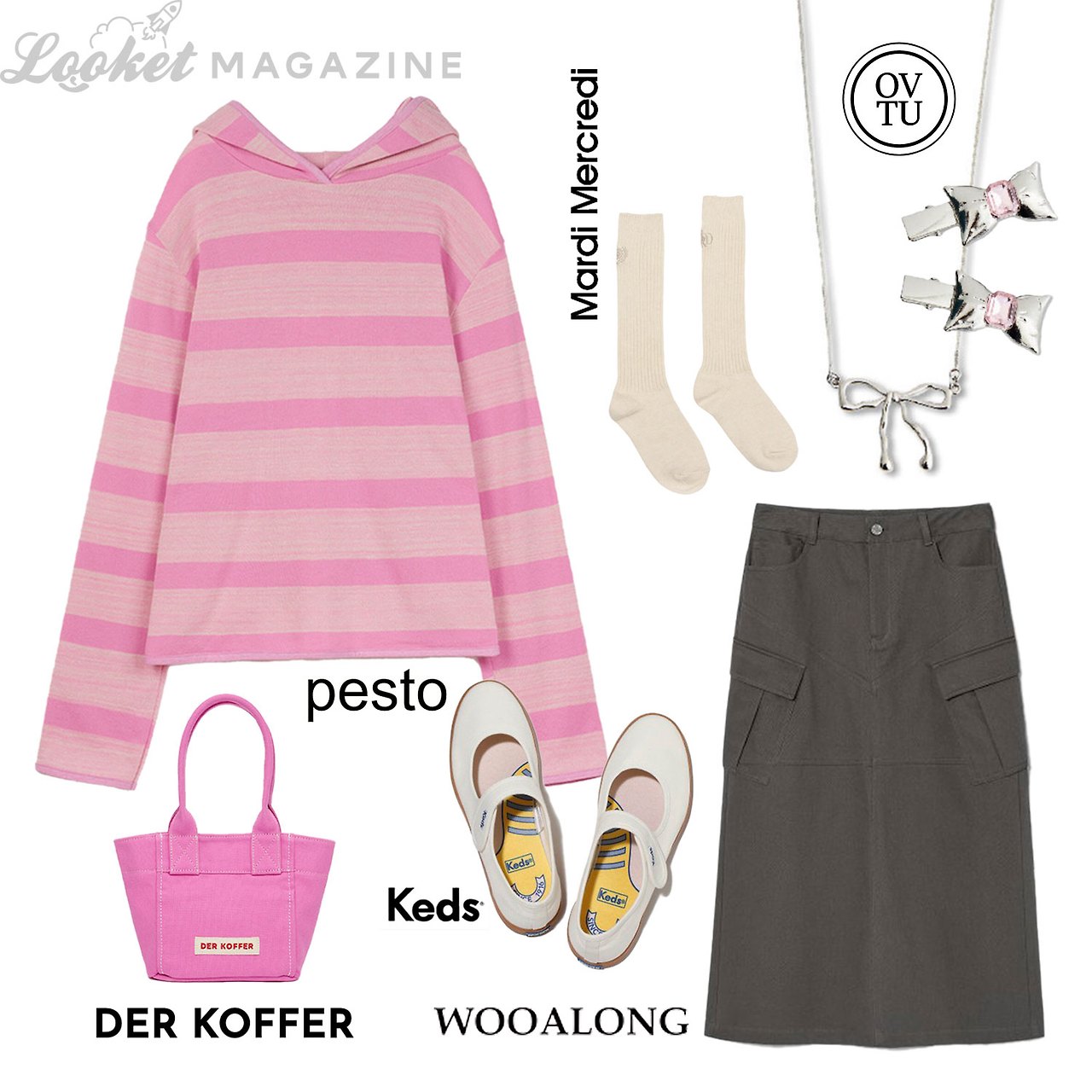 스트라이프 후드 카고 스커트 캔버스 메리제인 캔버스 쇼퍼백 양말 리본 목걸이 리본 핀