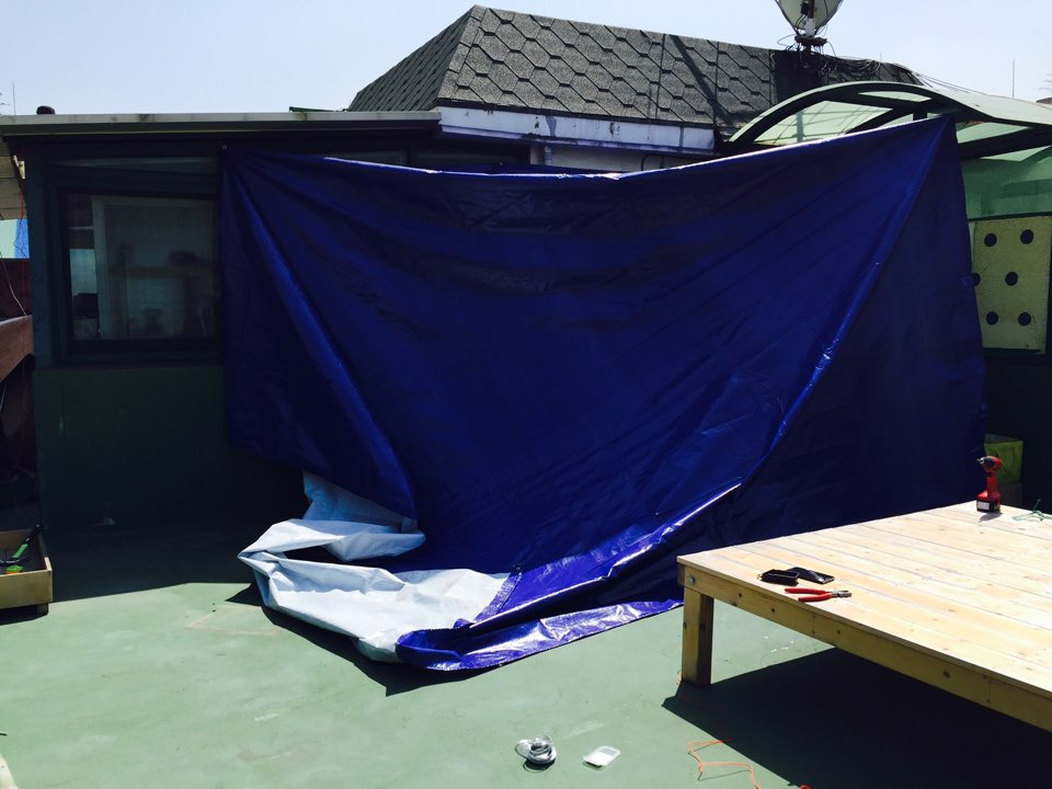 철사 등을 이용해 대나무를 고정한다. 이것도 의외로 쉽지 않은 작업이다. 그래도 태붕에도 버틸 수 있도록 단단히 작업을 한다, 다음으로, 천막 자리를 잡아 본다. 하... 저번에는 비 오는 날 친구랑 하면서 고생했는데 그래도 이번에는 한번 해본 거니 좀 더 쉽겠지? 천장의 나사들을 활용하여 줄을 묶고 먼저 한쪽을 올린다. 역시 쉽지는 않다. 하지만 확실히 두 번째라 대략 감이 온다. 결국 대나무까지 모두 묶어서 천막을 모두 올린 후 앞면은 글루건을 활용하여 접어서 붙임으로서 마무리 작업까지 완료한다.