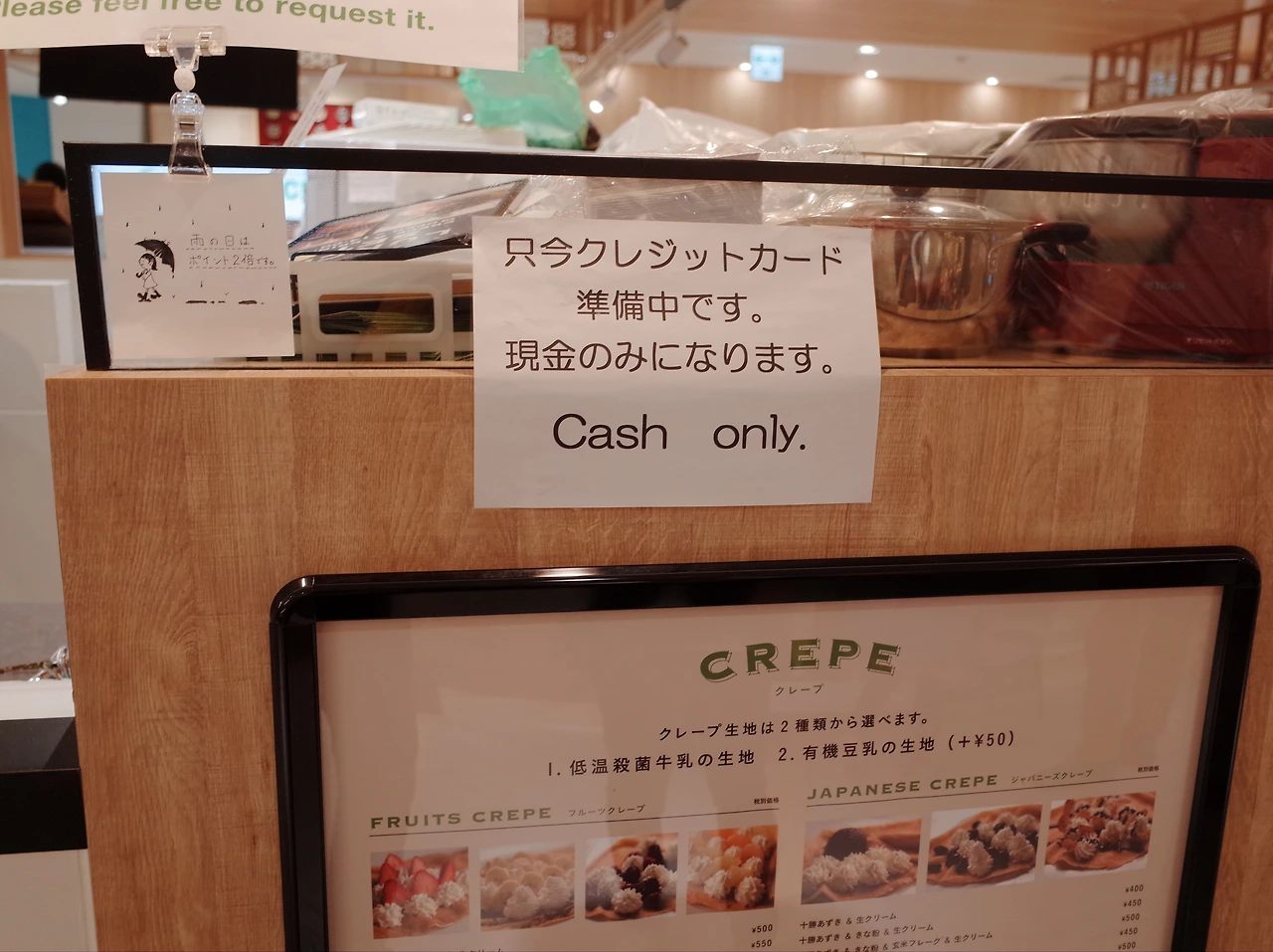 크레페도 카드 금지, 현금 온리라고 쓰여 있다. 일본 같이 발달한 나라가 신용카드 시스템을 안쓰는 것이 참 이해가 안된다. 지금 다니는 회사가 문과 관련된 보안회사이고 나는 현재 국내 도어록 브랜드 마케팅을 하고 있는데, 일본을 조사해보면 도어록도 거의 안쓰고 있다. 편리한 것을 싫어하는걸까? 아님 뭔가 다른 내면의 이유가 있을까.