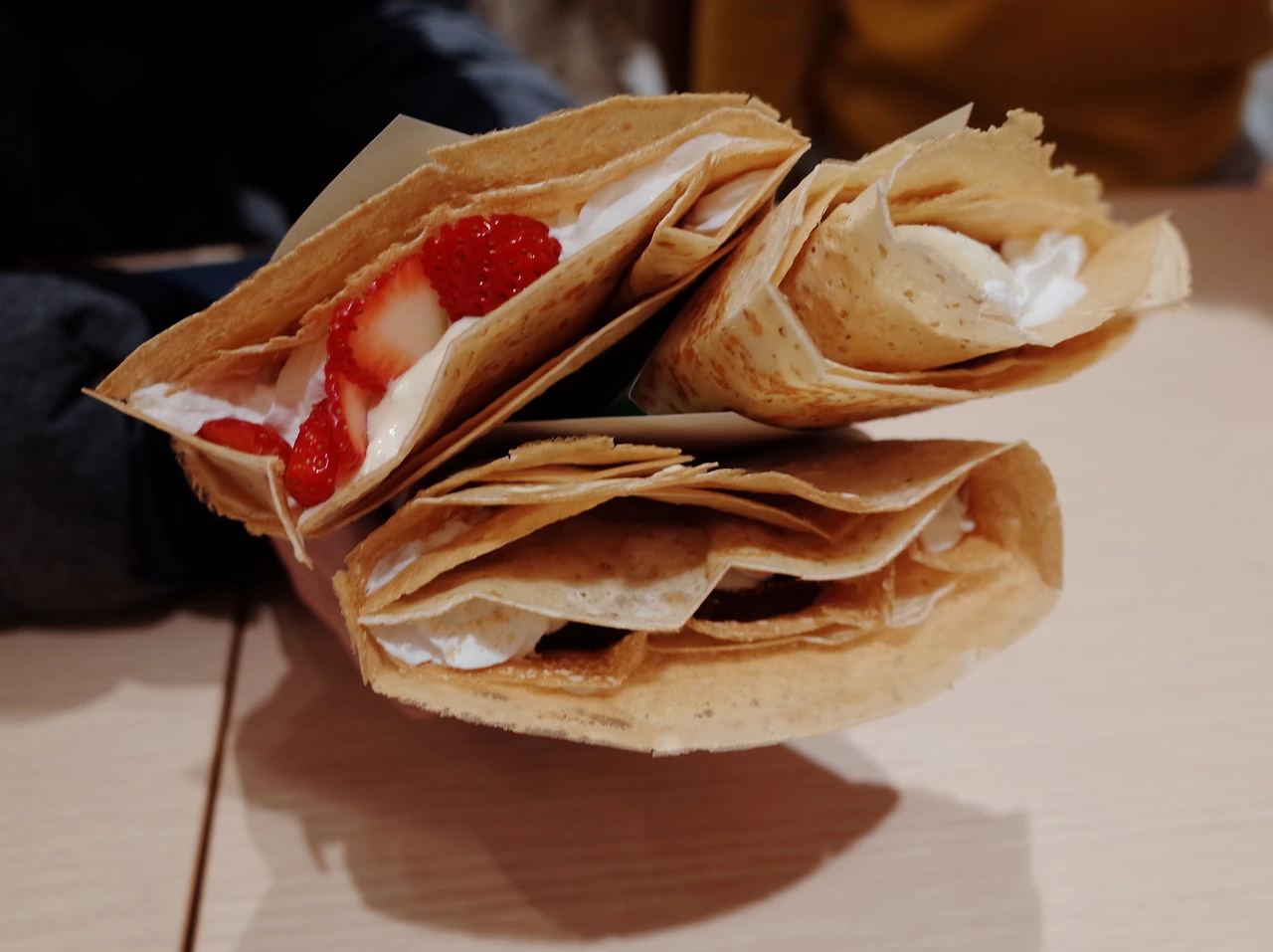 다 사니 1시가 넘었다. 2시 기차를 타야 하니 시간이 얼마 없다. 그래도 그냥 보내기는 미안해서 백화점 안에 있는 일본식 크레페를 하나씩 주문해서 가지고 앉는다. 크레페 맛있다고 생각한적 별로 없는데, 역시 일본이라 그런지 꽤나 맛있다. 편의점도 맛있는 일본이니 뭔들 맛이 없겠나.