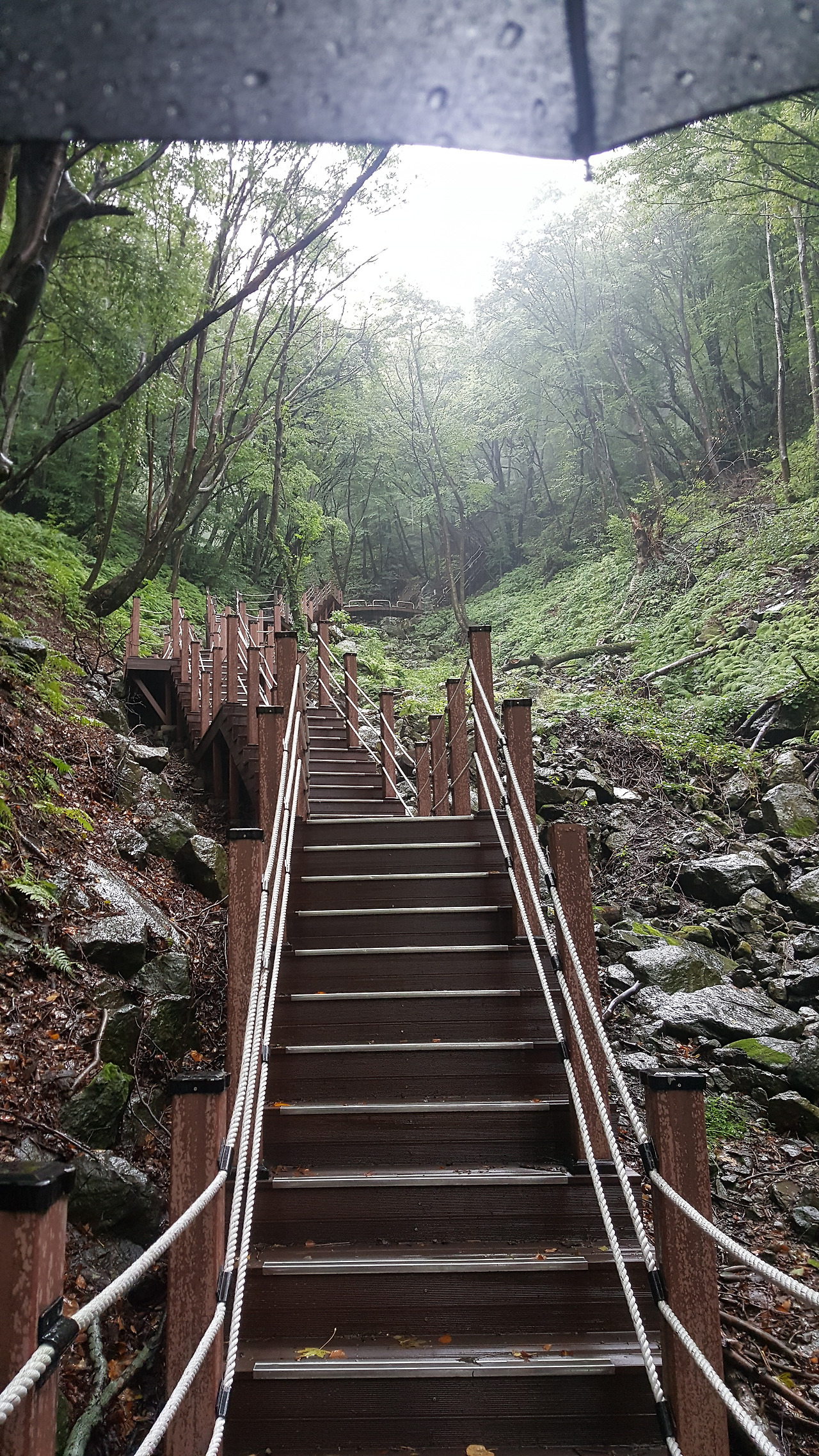 갑자기 비가 오기 시작한다. 이깟 비가 내 앞길을 막을소냐라는 마음으로 패딩을 꺼내 입고 우산을 쓰며 꾸준히 앞으로 나아간다. 아까까지는 트래킹이었다면 이제부터는 등산의 영역에 들어선 느낌이다. 길이 가파라지더니 계단까지 나온다.