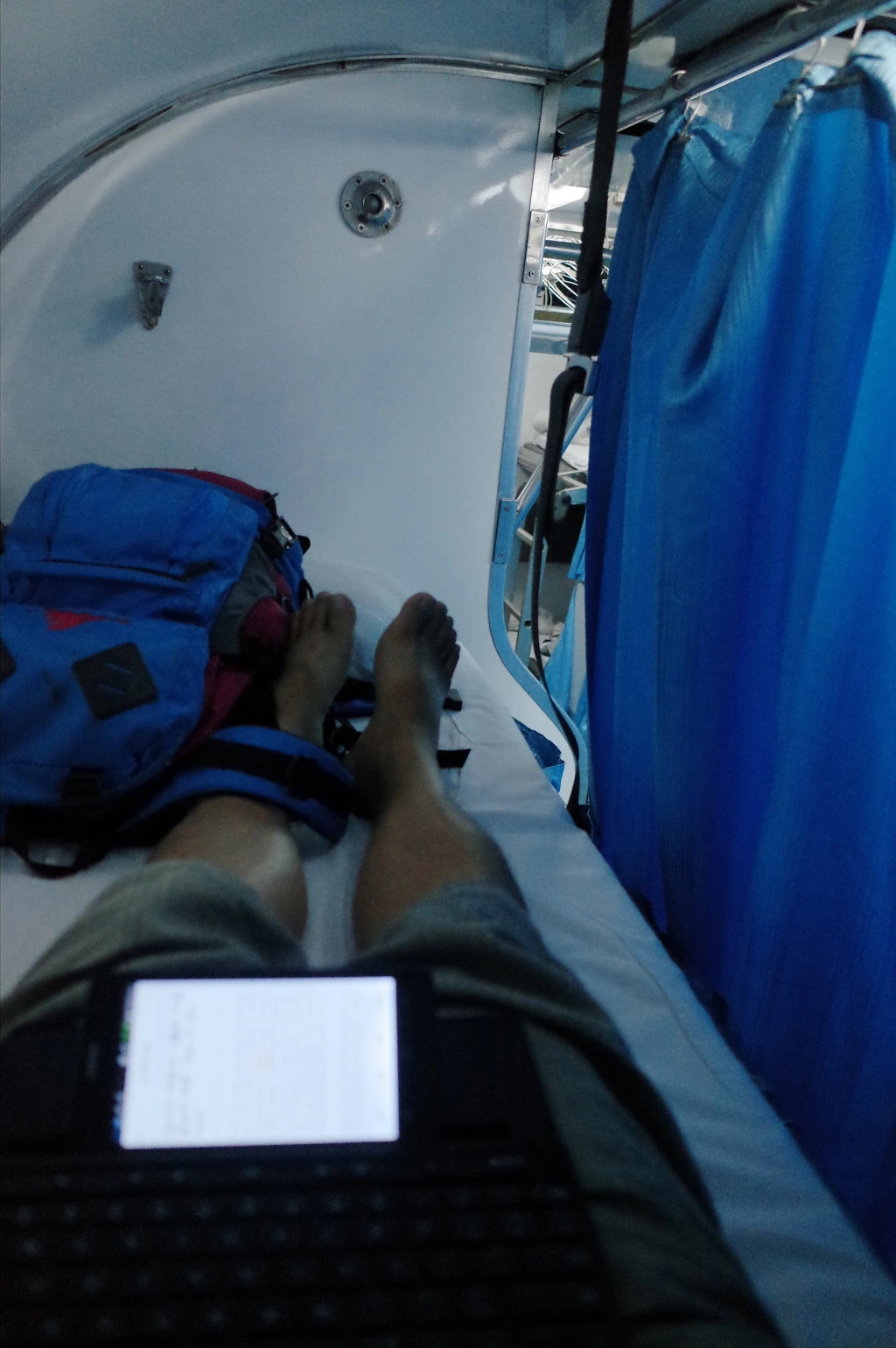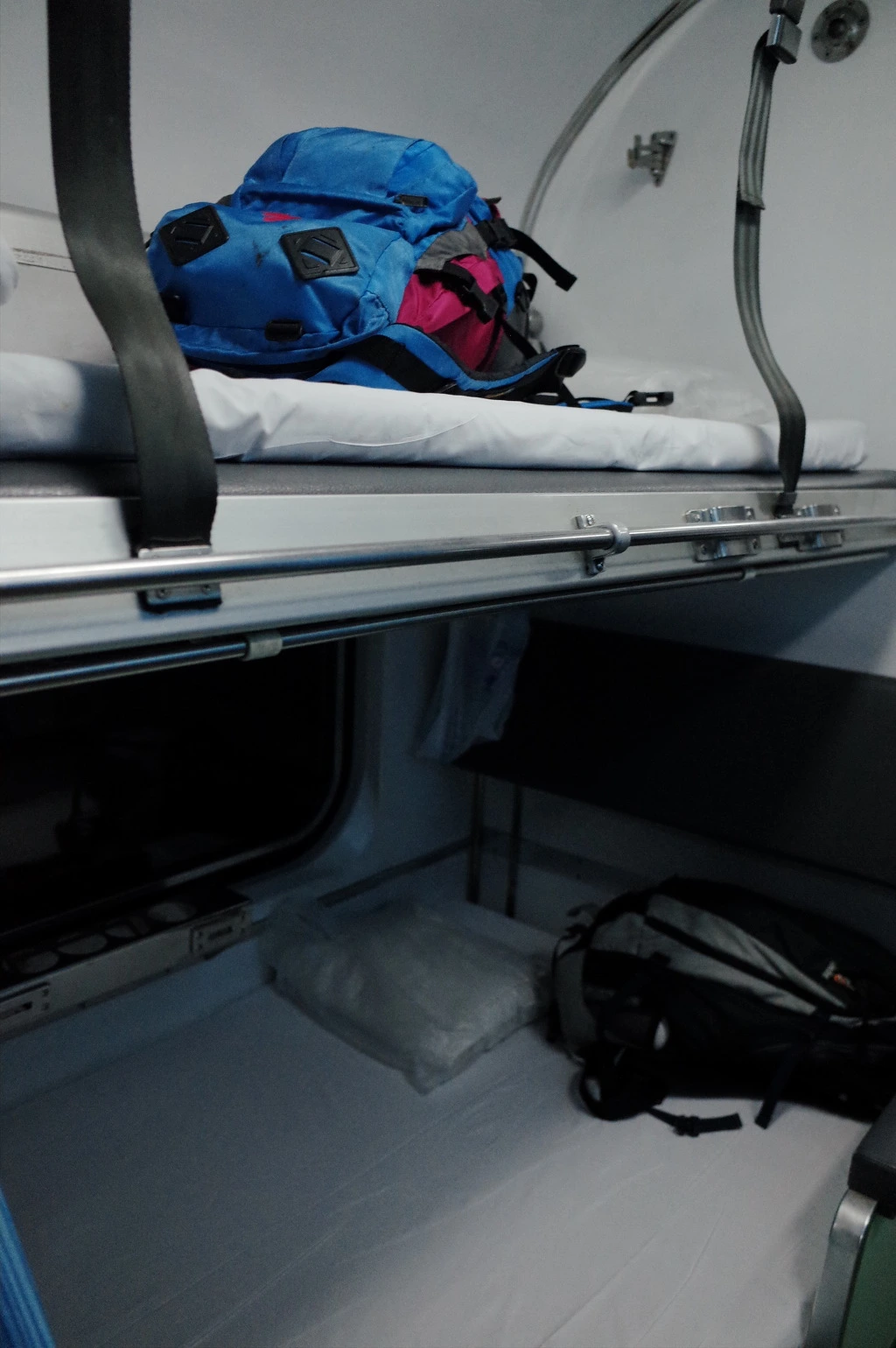 의자가 침대로 변신하는 동안 옆으로 피해있다가 완성이 된 후에 2층으로 올라선다. 2층은 더 싸서 그런지 침대가 1층보다 좁다. 하지만 떨어지는걸 방지하는 안전 줄도 있어서 그리 불안하지는 않다. 이 정도면 2층도 내 기준에서는 훌륭하다.