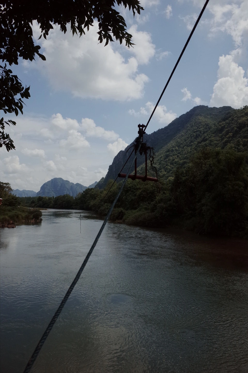 식당 안쪽을 보니 강가를 향해 높게 서 있는 구조물이 보인다. 이거는 사람들이 그냥 여기서 다이빙하고 뛰는 건가? 좀 높아 보이는데. 한번 볼까 싶어서 가까이 가니 그 구조물의 가운데로 줄이 시작해서 강 반대편까지 이어져있고 손잡이까지 있는 것이 보인다. 찾았다, 오늘의 보물섬! 아니다 싶어서 그냥 나갈뻔했는데 포기하지 않고 안으로 들어온 것을 보니 그래도 아직 운이 남아있나 보다. 세 번 만에 찾다니, 나는 정녕 행운아인가.