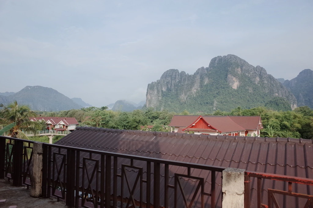 뒤편으로 가니 방비엥 뒷산(?)이 무협지에 나오는 산처럼 몽환적으로 펼쳐져있다. 고산지라 그런지 구름이 산에 걸쳐있는 것이 인상적이다. 배산임수는 아니지만 산과 물이 모두 있으니 휴양지로서는 최적이다. 물만 조금 더 깨끗했으면 좋겠지만 완벽할 수는 없겠지.