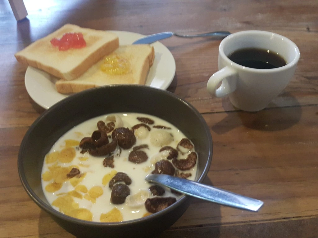 나와서 간단히 세수만 하고 (머리 감는 것도 세수에 포함) 조식을 먹으러 로비로 나온다. 잊기 전에 수건과 열쇠를 반납하고 어제 맡겨놓은 300밧 디파짓을 돌려받고 셀프 조식대로 향한다. 어제 먹었던 루프뷰의 아침에 비하면 많이 부족하지만 사실 조식은 이 정도면 충분하다. 계란이 좀 아쉽긴 하지만 시리얼과 빵, 커피로 배를 채운다.
