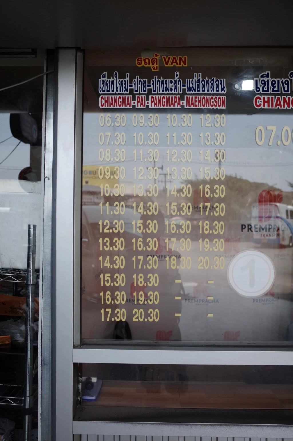 일단 버스 시간표를 보니 빠이로 가는 버스는 매시간마다 있다. 가격을 물어보러 가는데 옆에 있던 아저씨가 갑자기 호객 행위를 하면서 뒤편으로 가보란다. 호객 행위는 일단 경계 대상! 그래도 한번 물어보니 150바트이고 미니버스란다. 여기서 사는 건 큰 버스이고 가격은 물어보니 같은 150바트이다. 아 도대체 미니버스가 좋은가요, 큰 버스가 좋은가요. 선택의 연속이구먼. 알 길이 없는데 미니버스 쪽에 여행자들이 모여있는 것이 왠지 신뢰가 가서 그쪽으로 결제해버린다. 여기 멀미 굉장히 심한 구간이라는데 잘한 걸까? 뭐 조금 있으면 바로 알게 되겠지.